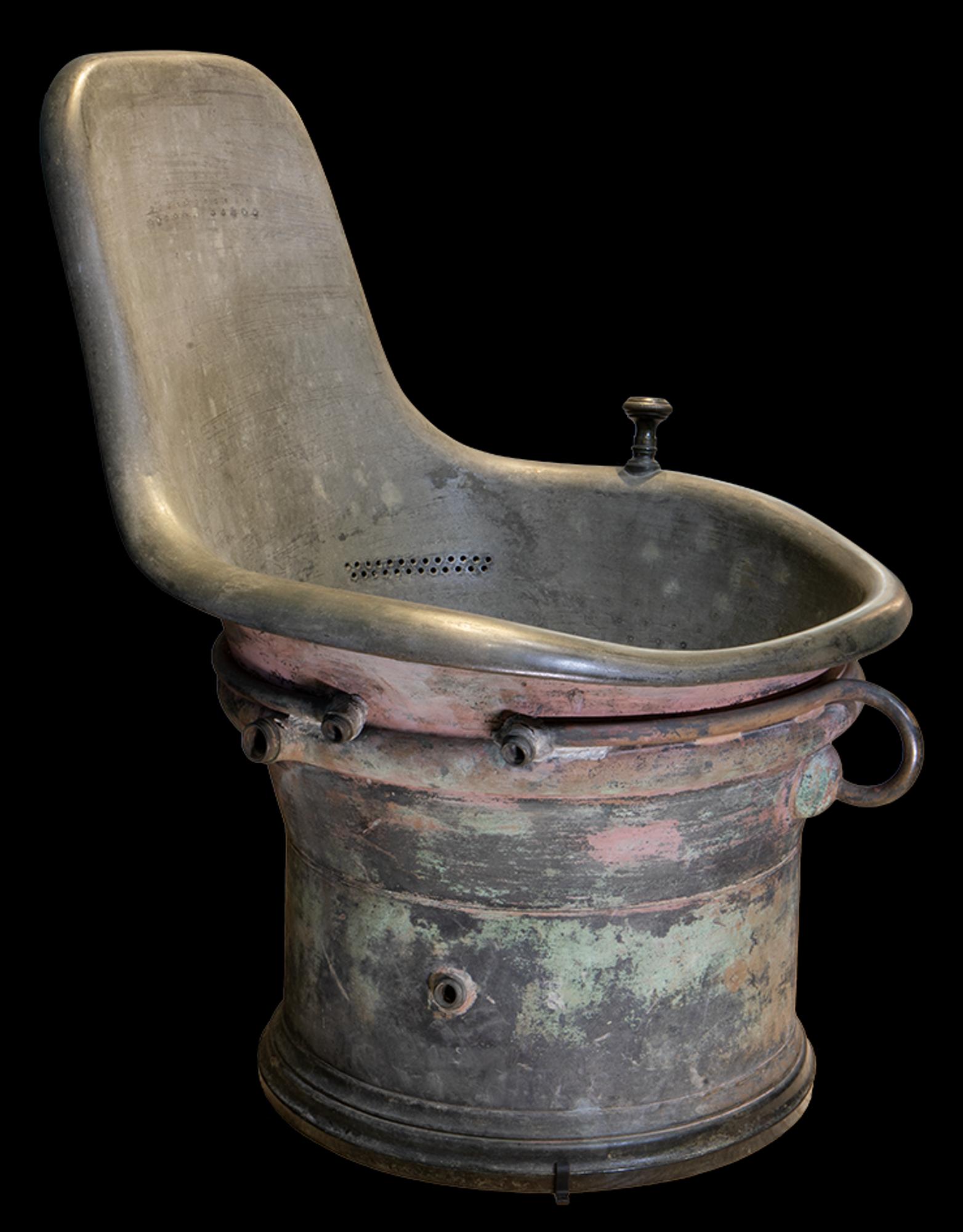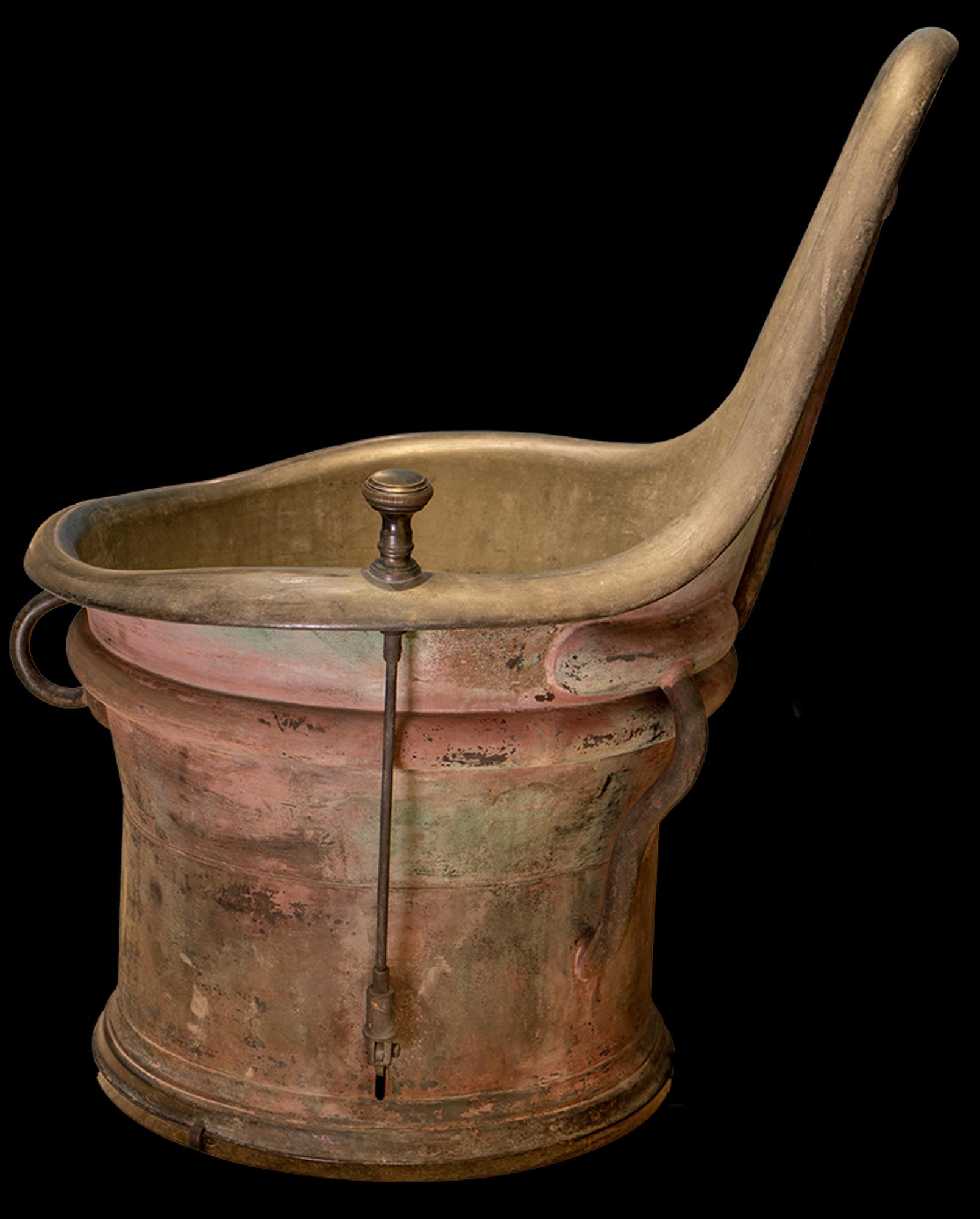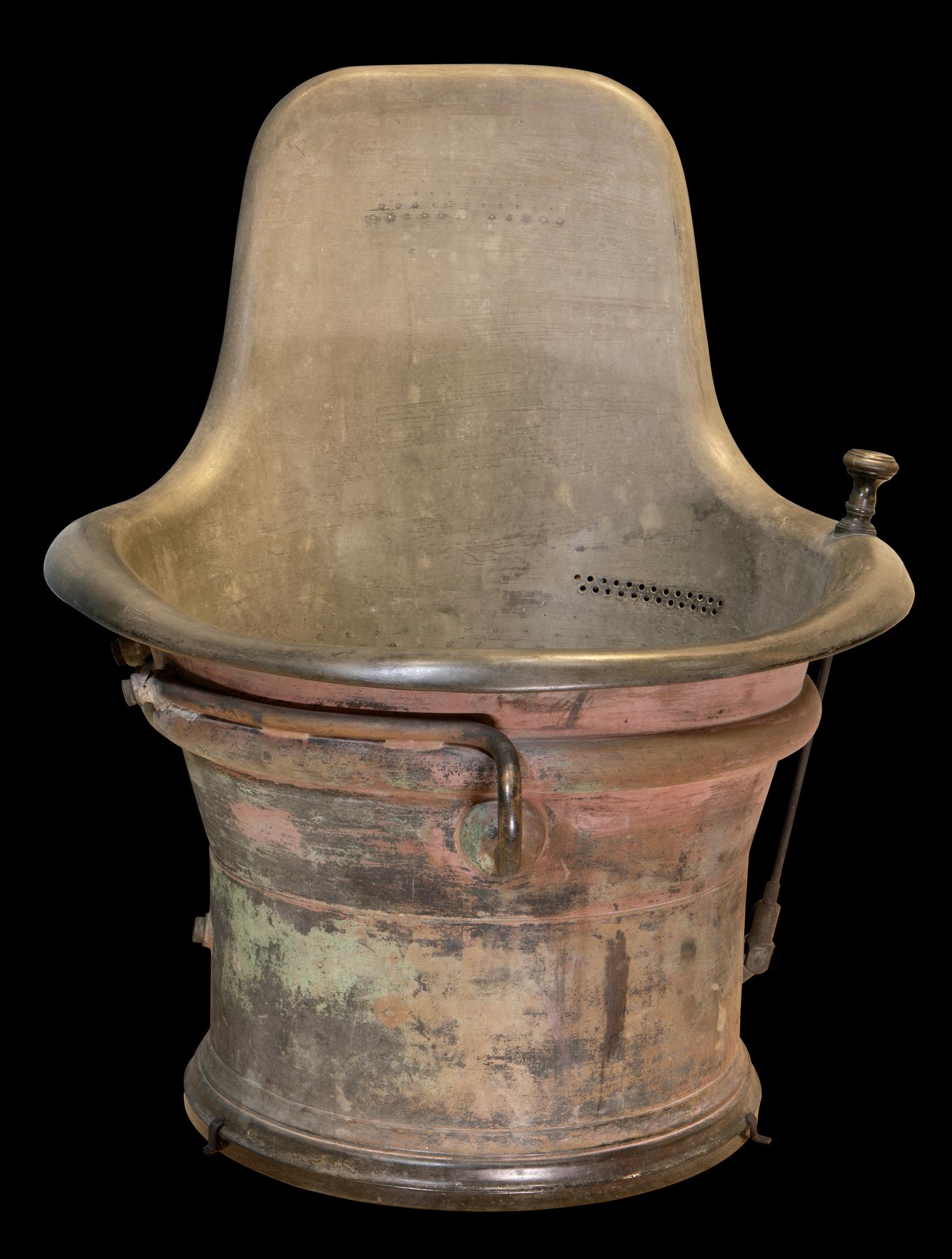 Les éléments de tuyauterie et du système d’évacuation de l’eau sont rapportés et fixés par brasage (tendre?) ; les bourrelets sont épais et non retravaillés. La manette d’ouverture de la bonde (vidage de la cuve) n’est pas fonctionnelle.
