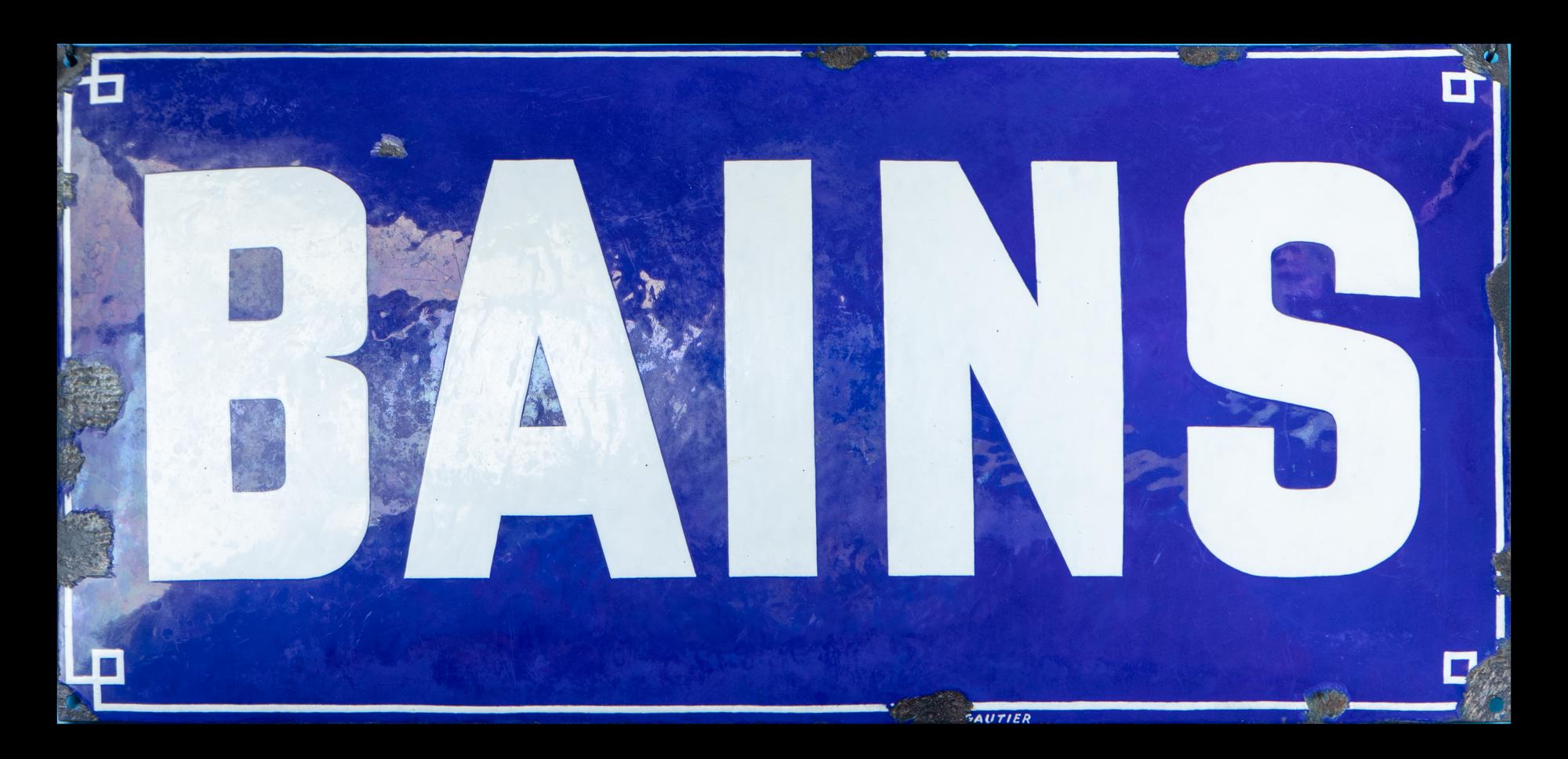 Inscription « BAINS » et liseré décoratif en blanc sur fond bleu.
