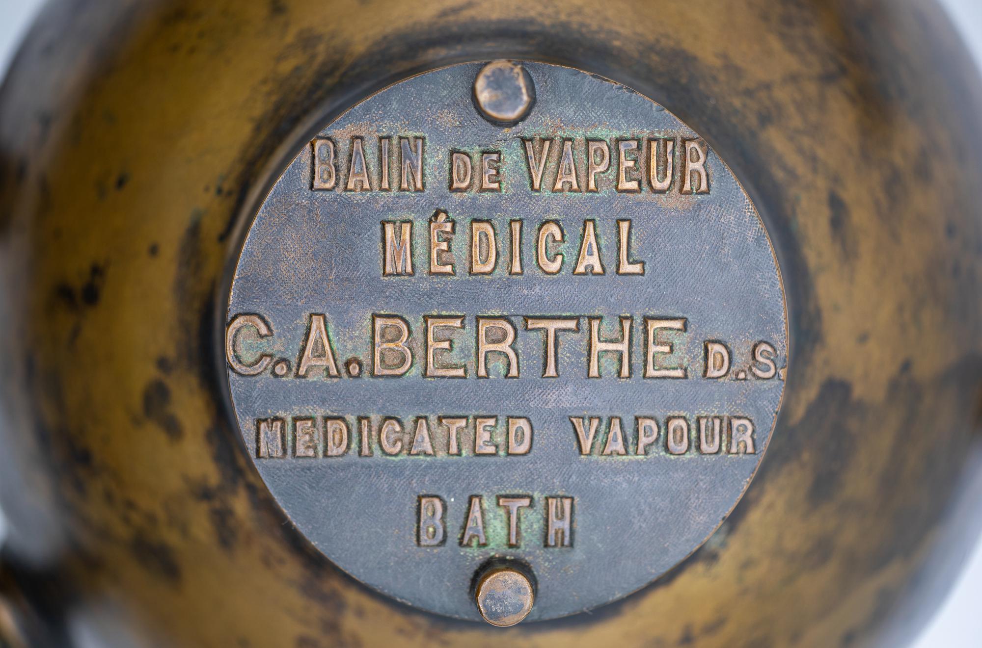 Boîtier sphérique servant d’échangeur thermique à serpentin, entre huit différents circuits, certains munis d’un robinet vanne. L’ensemble est en alliage cuivreux jaune, avec un support de fixation mural de chaque côté. Le