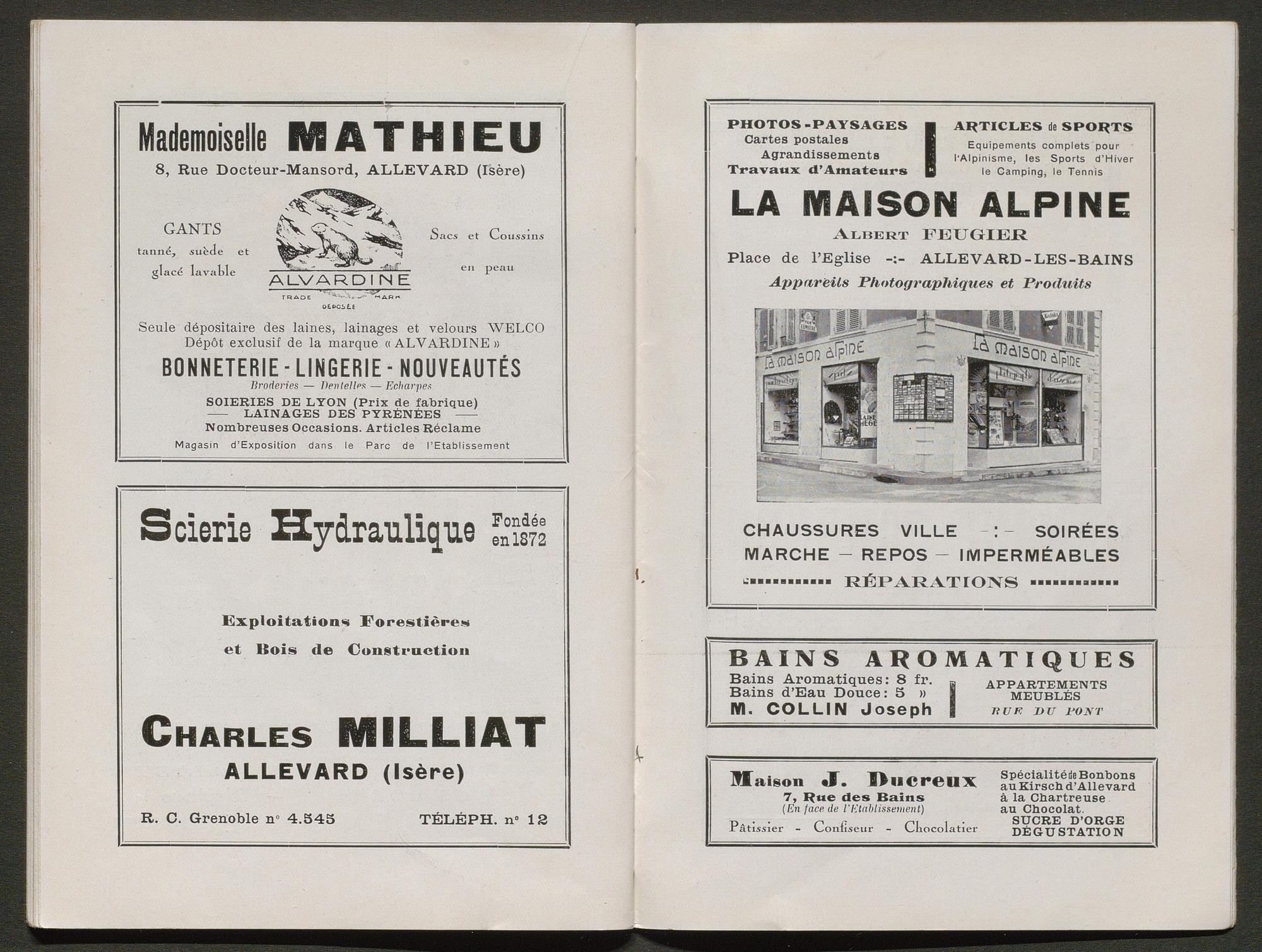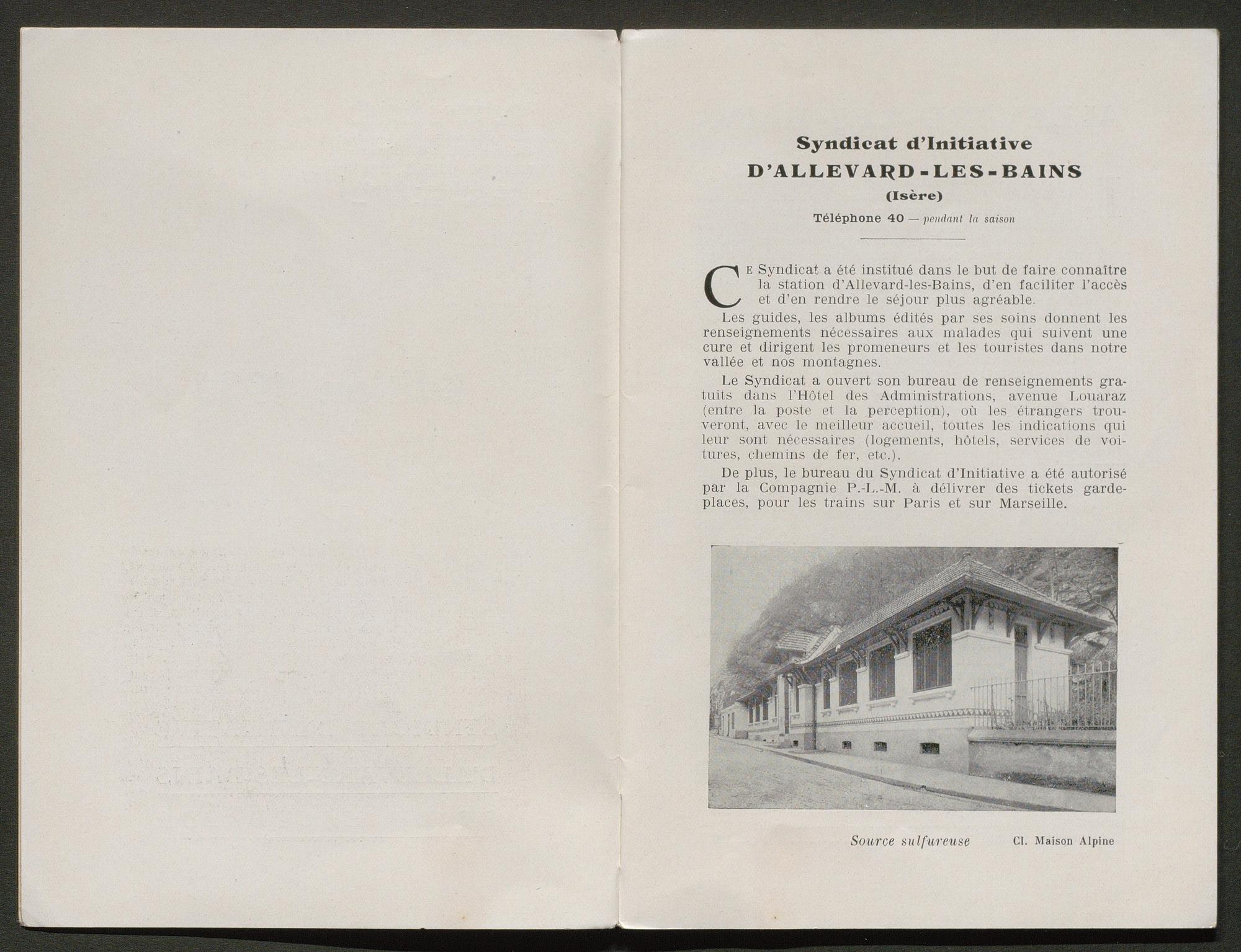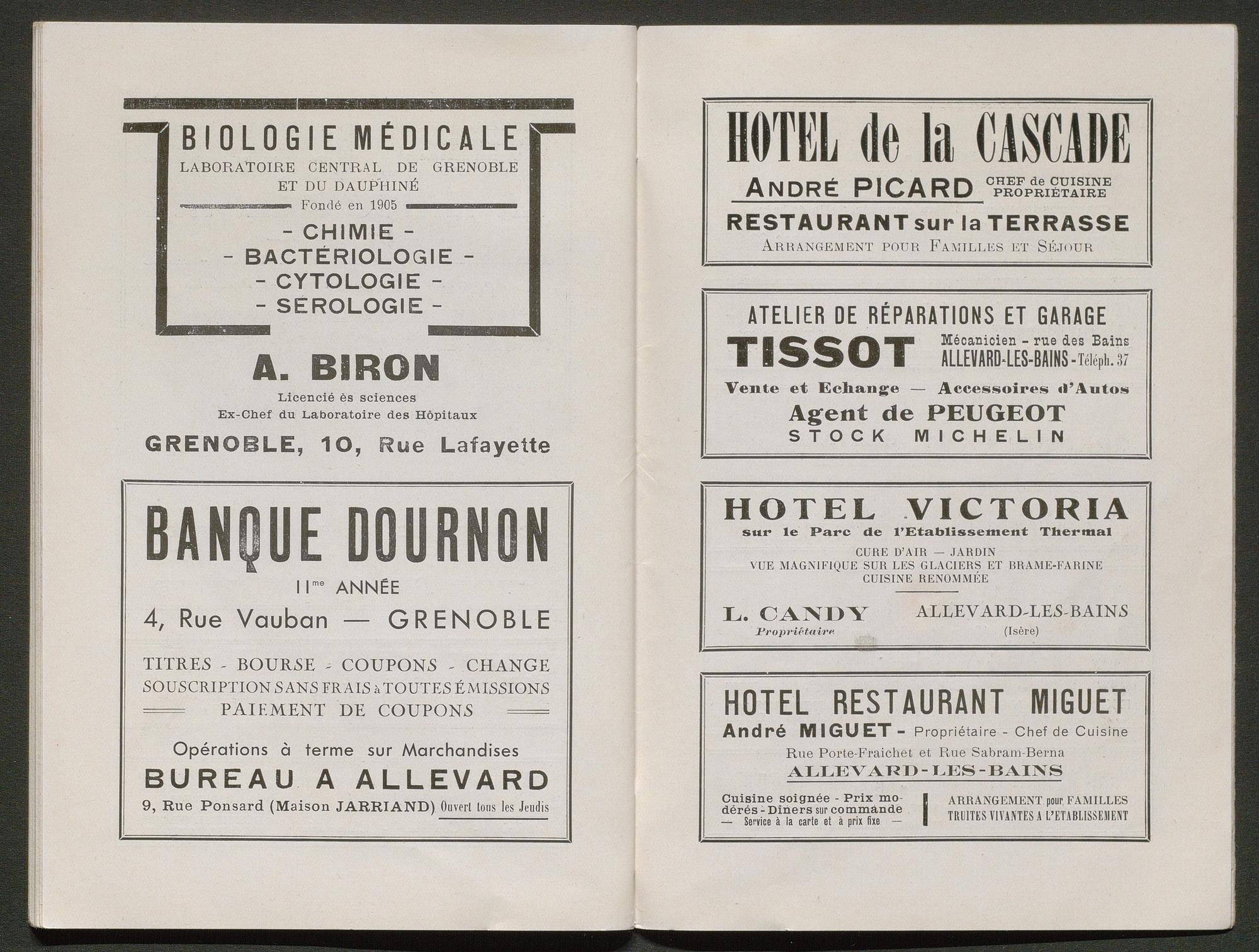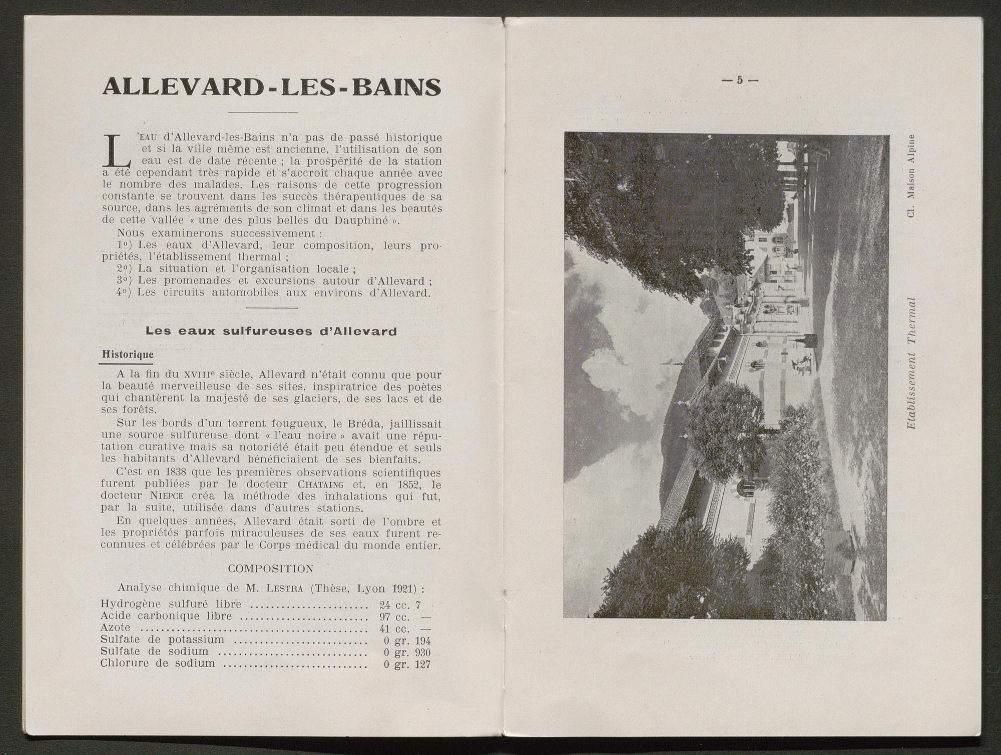 Ce guide touristique recense les activités proposées à Allevard pour les touristes/ curistes, ainsi que des pages publicitaires pour les commerces et hôtels du Pays d’Allevard. Il compte 29 double-pages.