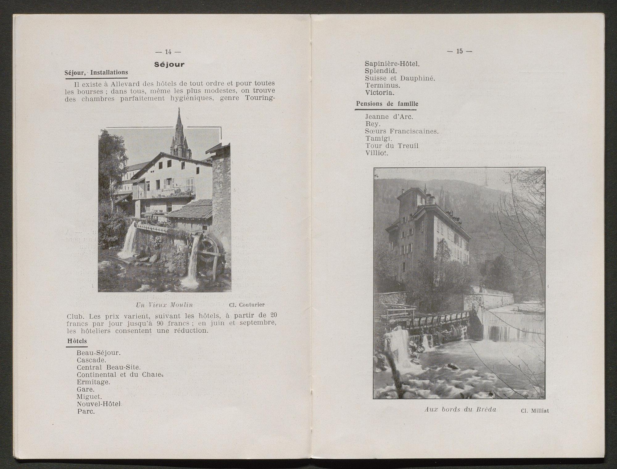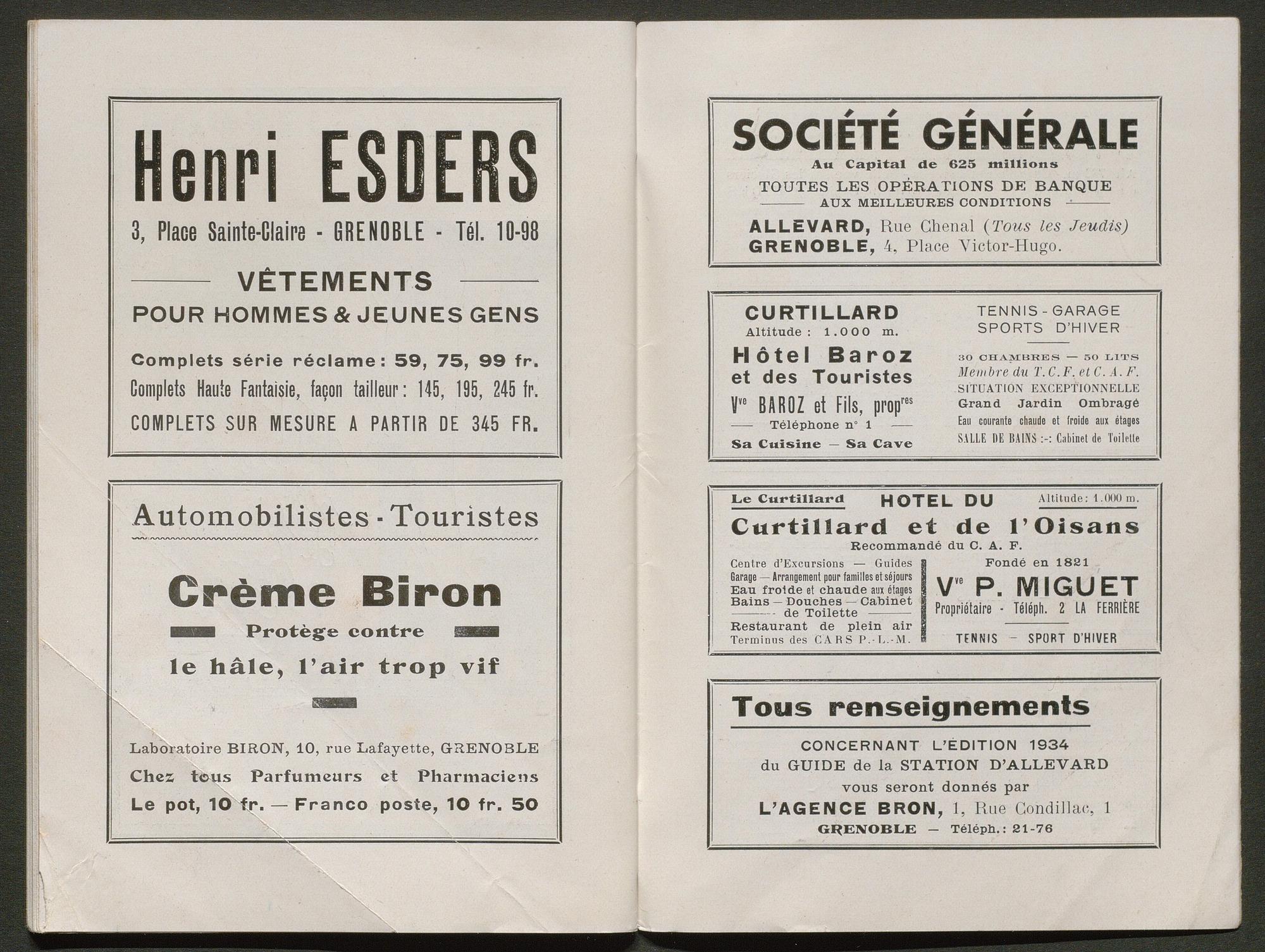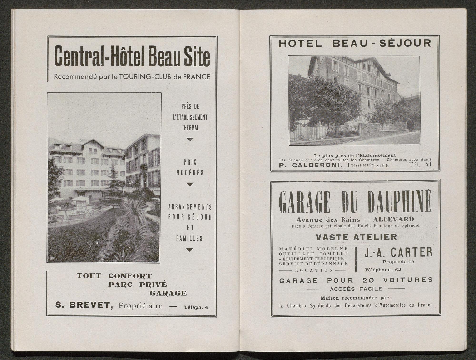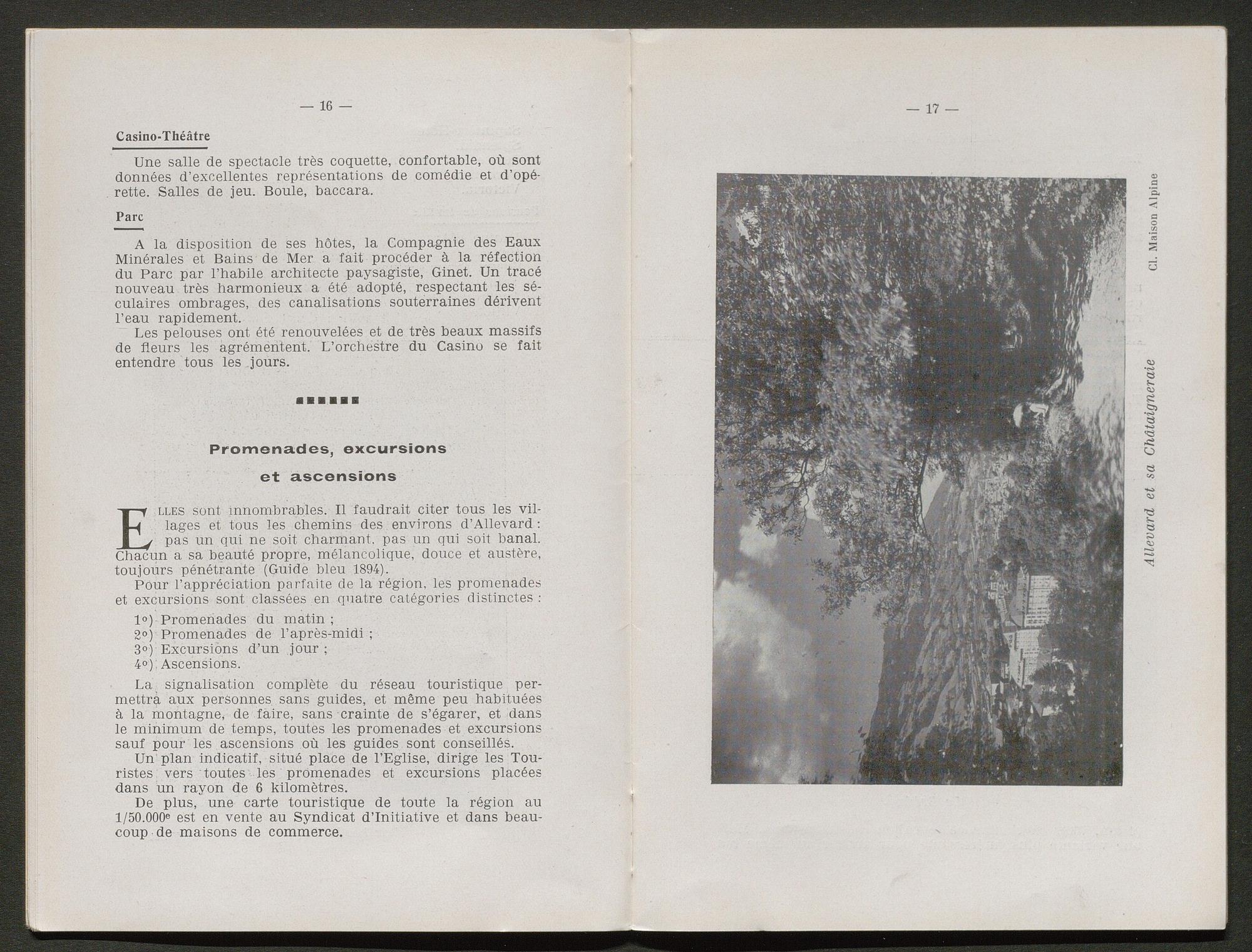 Ce guide touristique recense les activités proposées à Allevard pour les touristes/ curistes, ainsi que des pages publicitaires pour les commerces et hôtels du Pays d’Allevard. Il compte 29 double-pages.