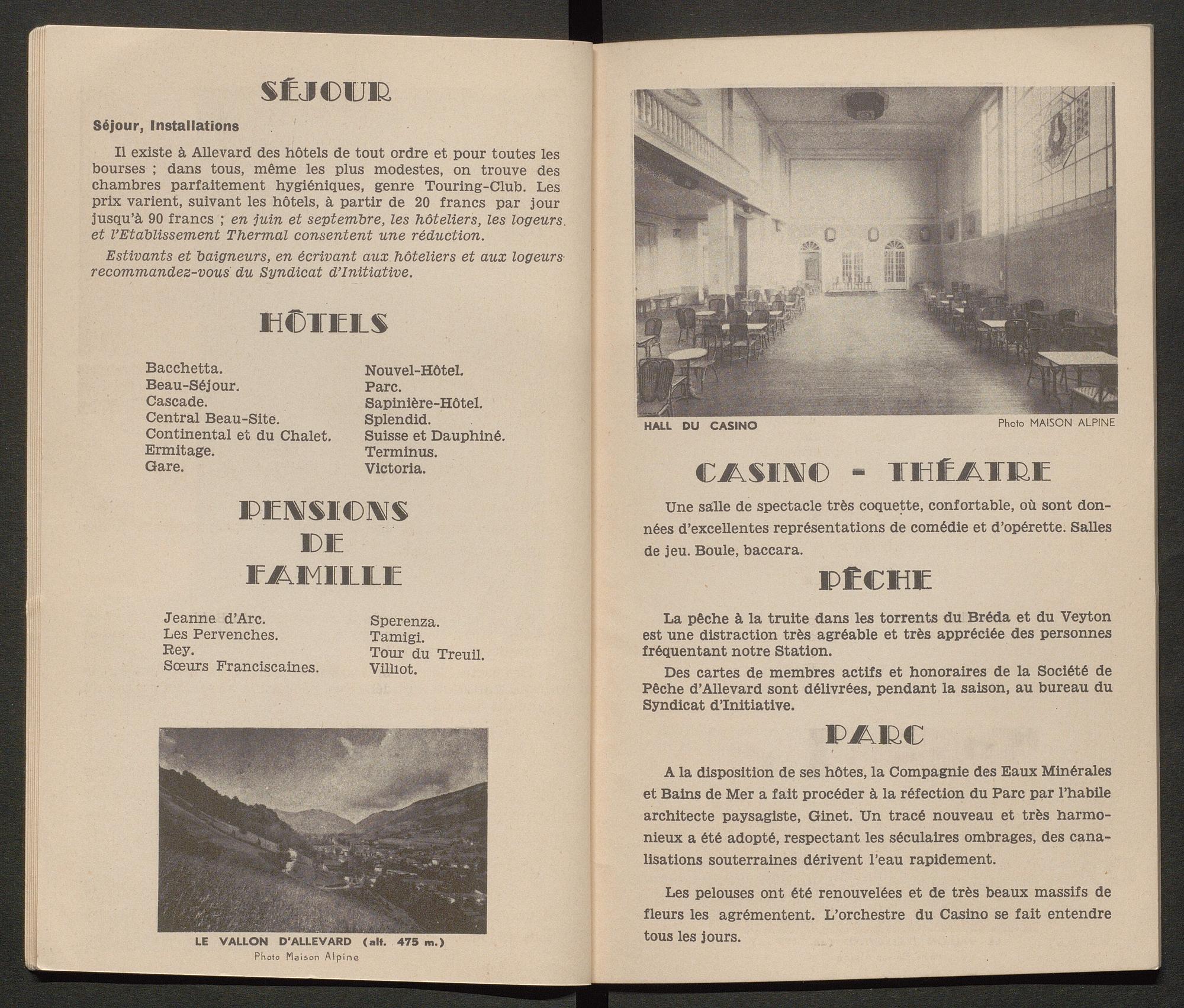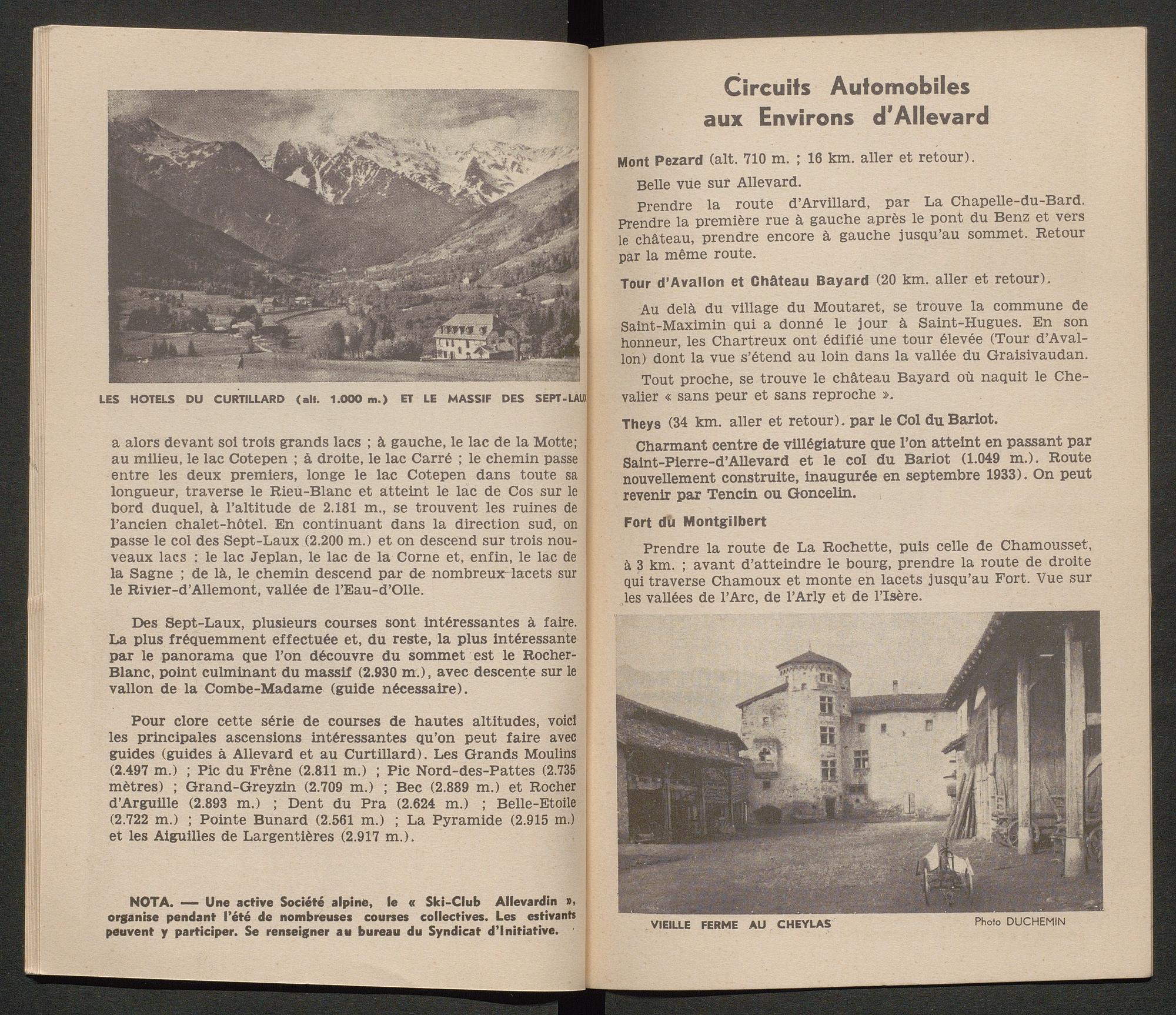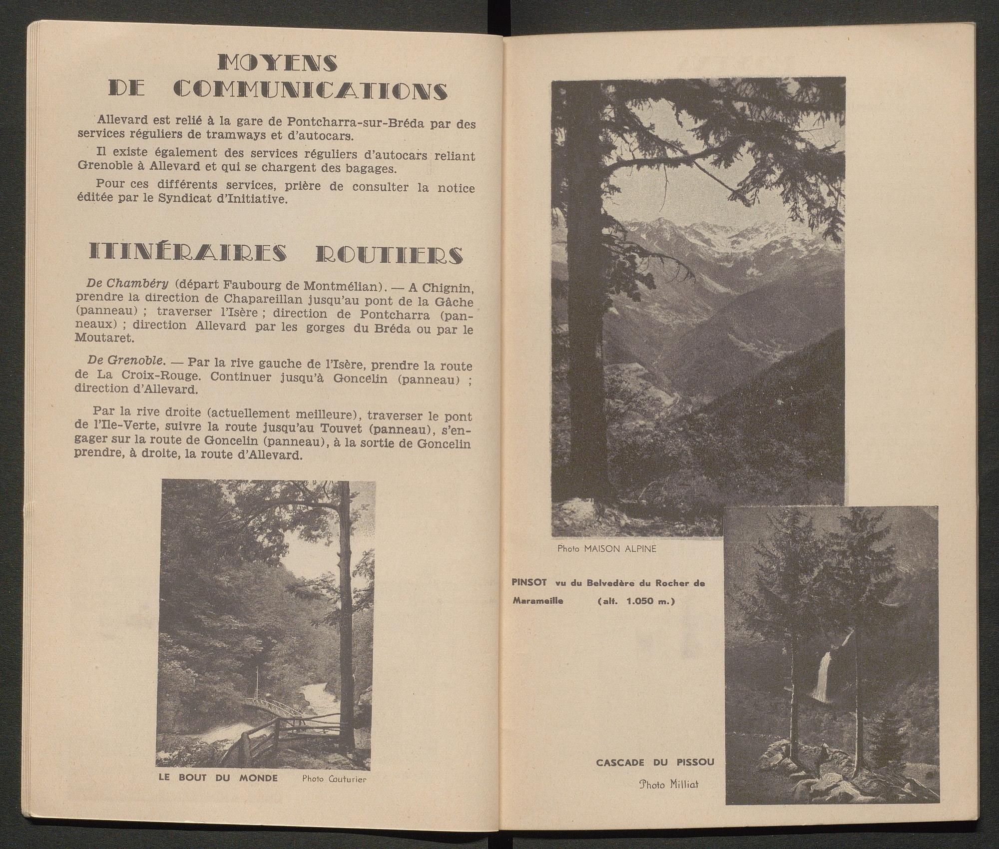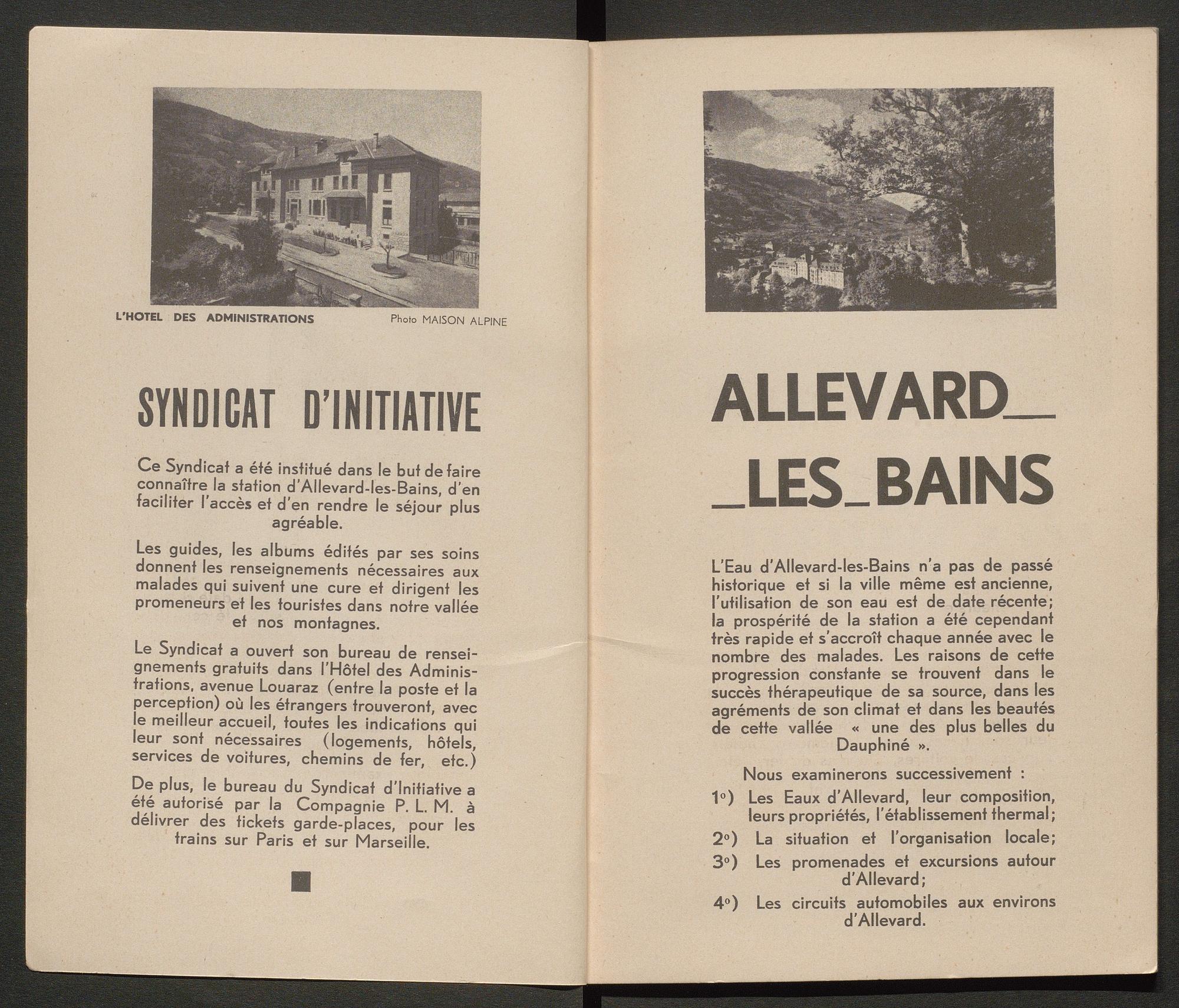 Ce guide touristique recense les activités proposées à Allevard pour les touristes/ curistes, ainsi que des pages publicitaires pour les commerces et hôtels du Pays d’Allevard. Il compte 34 double-pages.