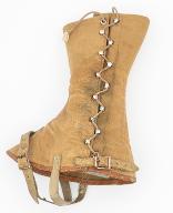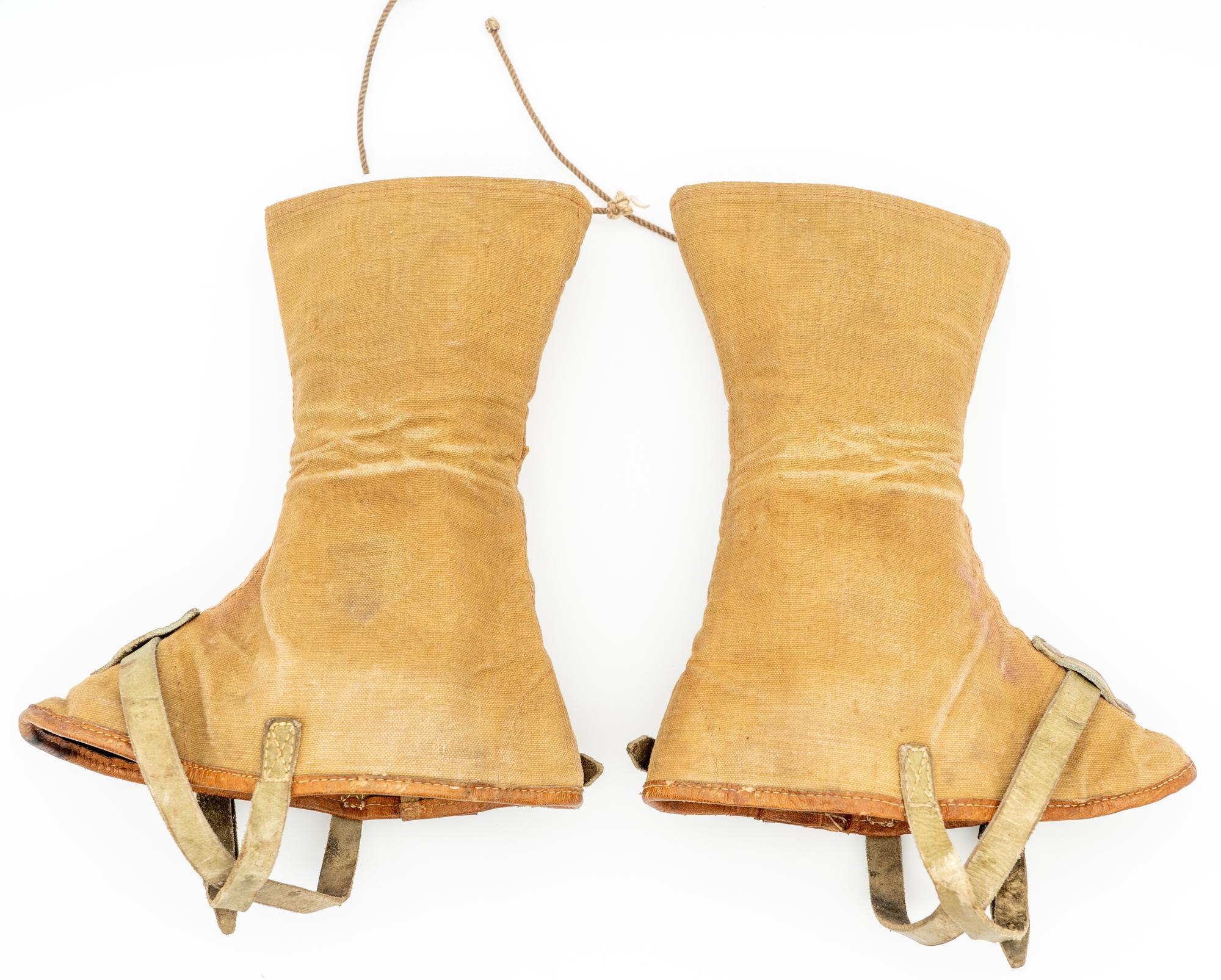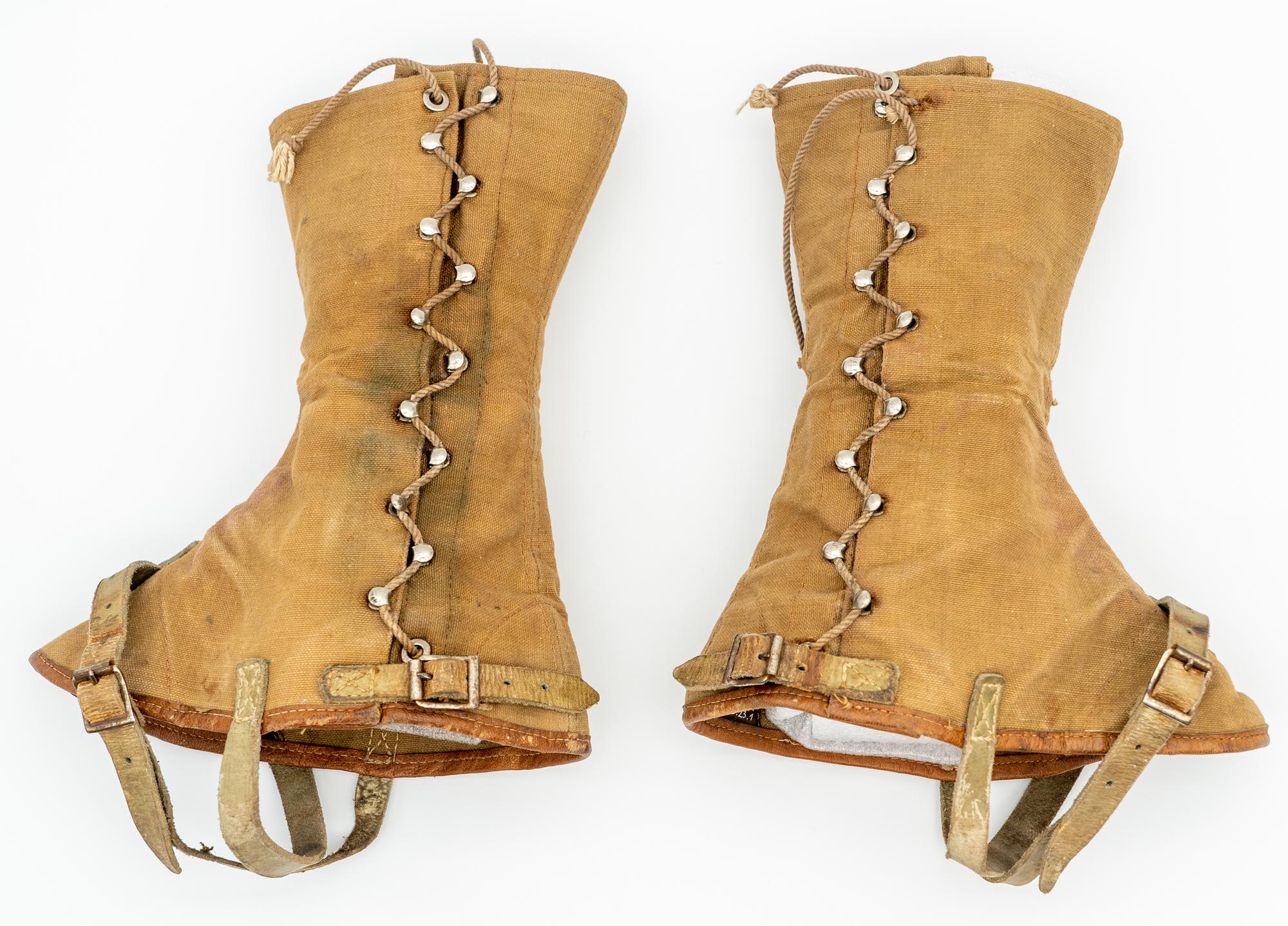 Paire de guêtres en toile épaisse avec renfort en cuir (bordure du bas, avant du pied, talon), assemblages par coutures. Les guêtres s’ouvrent sur le côté (externe) et sont maintenues par une cordelette passant de bas en haut à travers des crochets métalliques rivetés (x6 rangées de deux par guêtre). Longue cordelette fixée à travers un oeillet en bas et cordelette plus courte fixée à travers un oeillet en haut. Petite sangle en cuir cousue et sa boucle en métal et cuir riveté en bas de l’ouverture. Deux grandes sangles en cuir cousues dirigées vers le bas, l’une présente une boucle métallique l’autre 6 trous : pour maintenir sur la chaussure. Après étude et documentation de l’objet nous pouvons déduire que cette longue sangle se croise sous la chaussure, passe à travers un passant en cuir sur l’avant de la guêtre et vient s’attacher dans la boucle sur l’extérieur du pied. Des recherches (peu poussées) autour de la fonction de l’objet semble rattacher ce type de guêtres aux troupes de montagne, troupes alpines. Cet objet peut être liée à la 1er ou à le 2nd guerre mondial. L’hypothèse doit être étayée par des recherches plus approfondies.