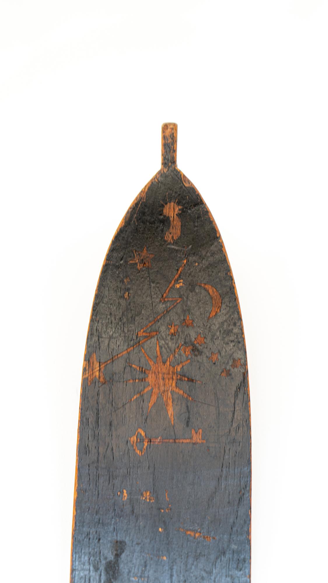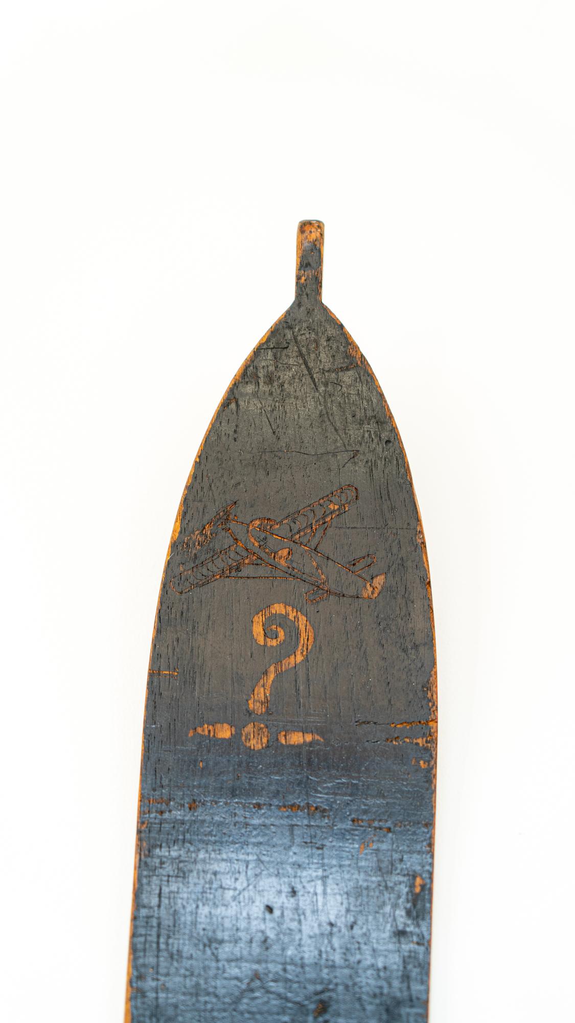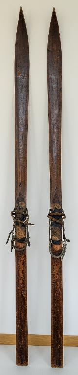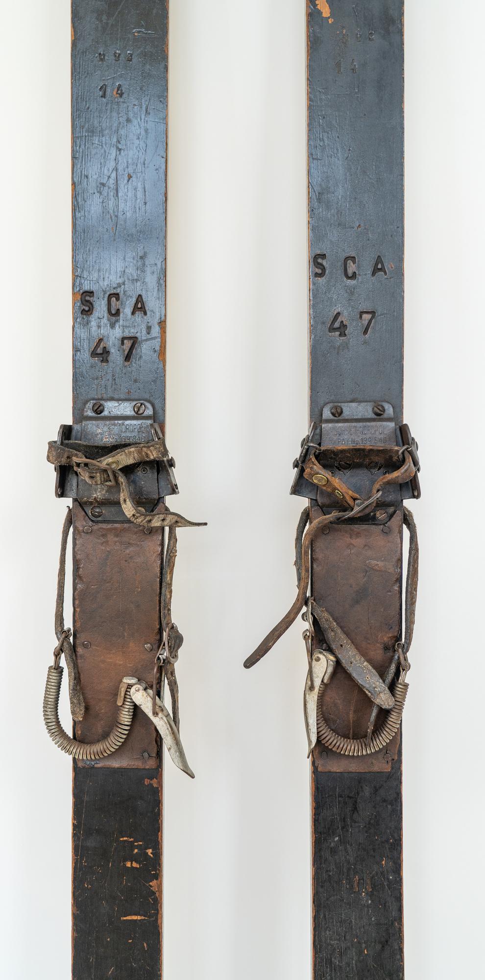 Une paire de skis en bois recouverte d’une couche noire de type bitumeuse. Planche rainurée sur le dessous (3 rigoles). Le ski n’est pas pourvu de carres métalliques. « Le ski est pourvu d’une fixation de la marque Ramy, munie d’un tendeur réglable, de crochets latéraux et d’un ressort de talonnière et d’une lanière en cuir avec boucle métallique. (fixation de type « Kandahar »). Fixation Ramy 50 ? Si oui créée par la marque en 1938-39. » (fiche musée) Une armature métallique pour accueillir la chaussure est fixée à l’aide d’une plaque métallique vissée à la planche. Le reste du système d’attache est constituée d’une plaque métallique avec bordures réglables (pour son ouverture) à l’aide de vis et de crans dentelés, deux anneaux sont fixés de chaque côté de cet élément pour le passage d’une lanière en cuir avec boucle métallique de serrage. Il pourrait s’agir d’un système de fixation de type « Alpina » ( ? Sources :https://skispatrimoine.blogspot.com/2021/07/fixations-1-une-histoire-de-talon-libre.html) avec possibilité de réglage des étriers. Nous n’observons pas de tendeur ni d’anciens trous pouvant indiquer une ancienne présence. Une seconde lanière de cuir est passée dans un trou réalisé dans le bois du ski elle maintient à l’aide de boucle de serrage une talonnière métallique à ressort (semblerait être le talon Bildstein à ressort, technique apparaissant en 1928 Sources :https://skispatrimoine.blogspot.com/2021/07/fixations-1-une-histoire-de-talon-libre.html). Une semelle en matière type latex ou linoléum (mélange d’huile de lin et de poudre de bois ou de liège sur toile après 1863) armée en dessous par une toile recouvre le bois de la longueur d’un pied, elle est maintenue par 6 pointes métalliques clouées dans le bois. Sur les deux skis les lanières arrières sont en cuir avec fourrures. Les lanières de devant sont différentes sur chaque ski. Une lanière sur le 985.2.1 présente une couche picturale blanche. La lanière du 985.2.2 est plus longue et présente un cuir tanné non peint. « Des trous présents sur le ski (rebouchés mais visibles sur les chants) indiquent qu’il était probablement pourvus d’une fixation de type « Huilfeld » : il s’agit d’un étrier à mâchoire métallique traversant le ski, et ajusté à la largeur de la chaussure. La fixation a pu être changée. » (Fiche musée).