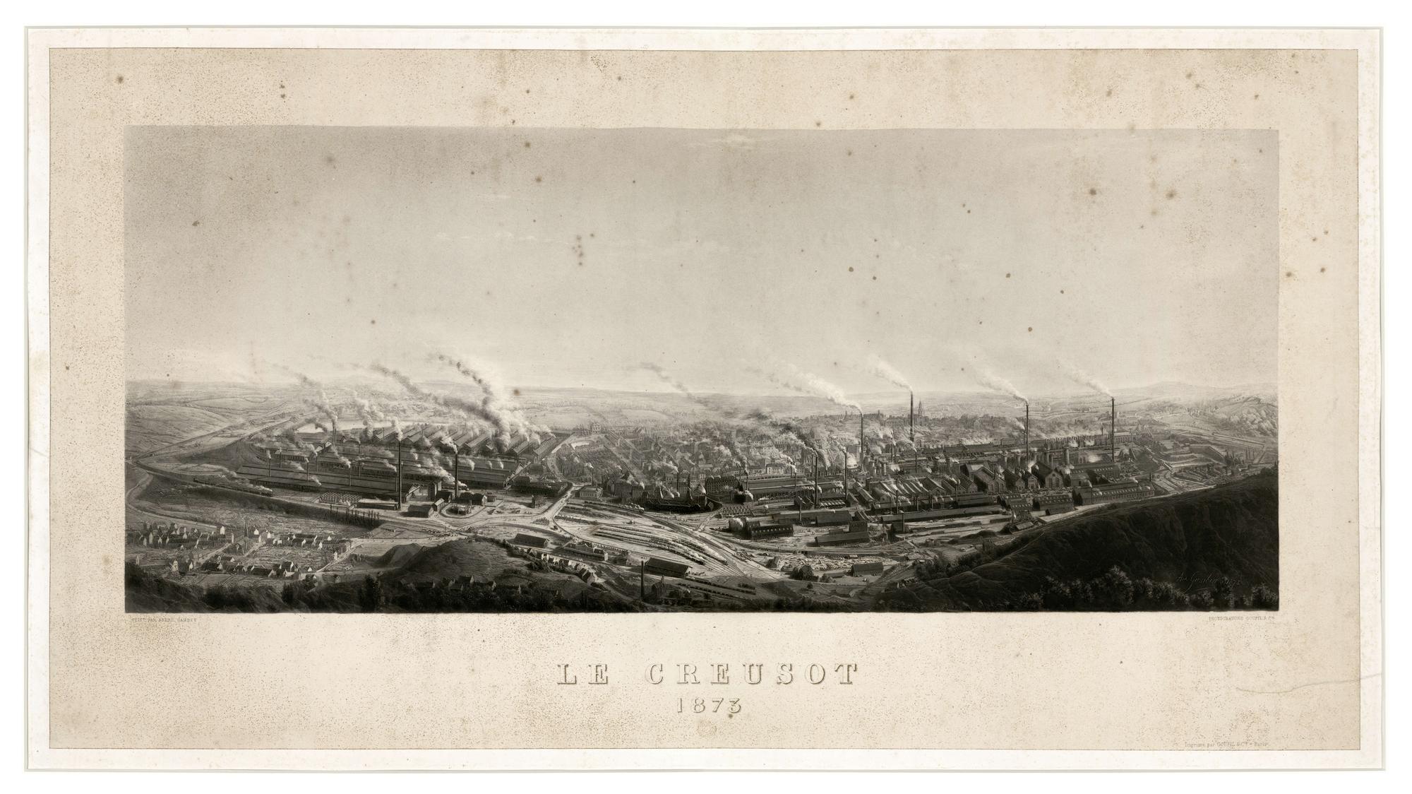 Cette estampe, réalisée d’après un tableau présenté à l’exposition universelle de 1873, glorifie l’empire industriel des Schneider. On la retrouve d’ailleurs à l’époque reproduite sur les albums et catalogues du Creusot, en préambule de la liste des produits vendus par l’entreprise. Grandes cheminées laissant s’échapper une épaisse fumée, succession d’ateliers industriels aux toitures en dent de scie, réseau dense de voies de chemin de fer, cités ouvrières, la ville semble vivre au rythme de l’industrie métallurgique. En 1870, la moitié des habitants du Creusot sont des ouvriers !