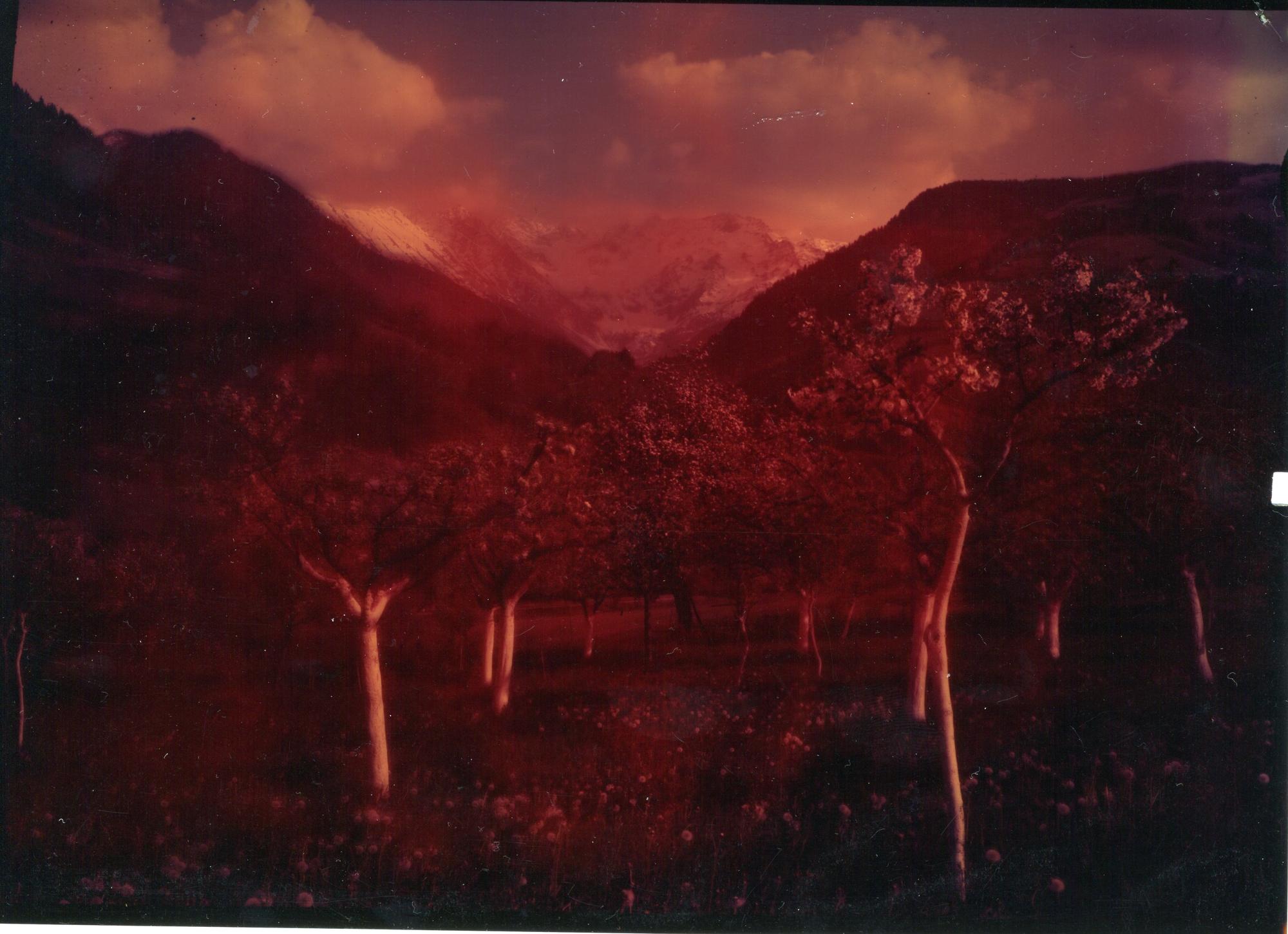 Arbres en fleurs. Au fond le Gleyzin et le Mont Mayen