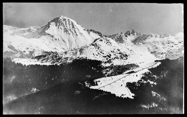 Le Collet d’Allevard en hiver. Vue aérienne de l’ensemble des champs de neige