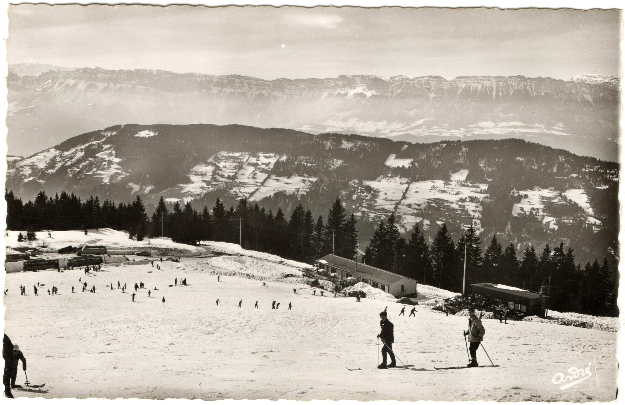 Cette carte postale monochrome des années 1950 présente les pistes de sports d’hiver de la station du Collet d’Allevard, avec en arrière-plan un panorama sur le massif de la Chartreuse.