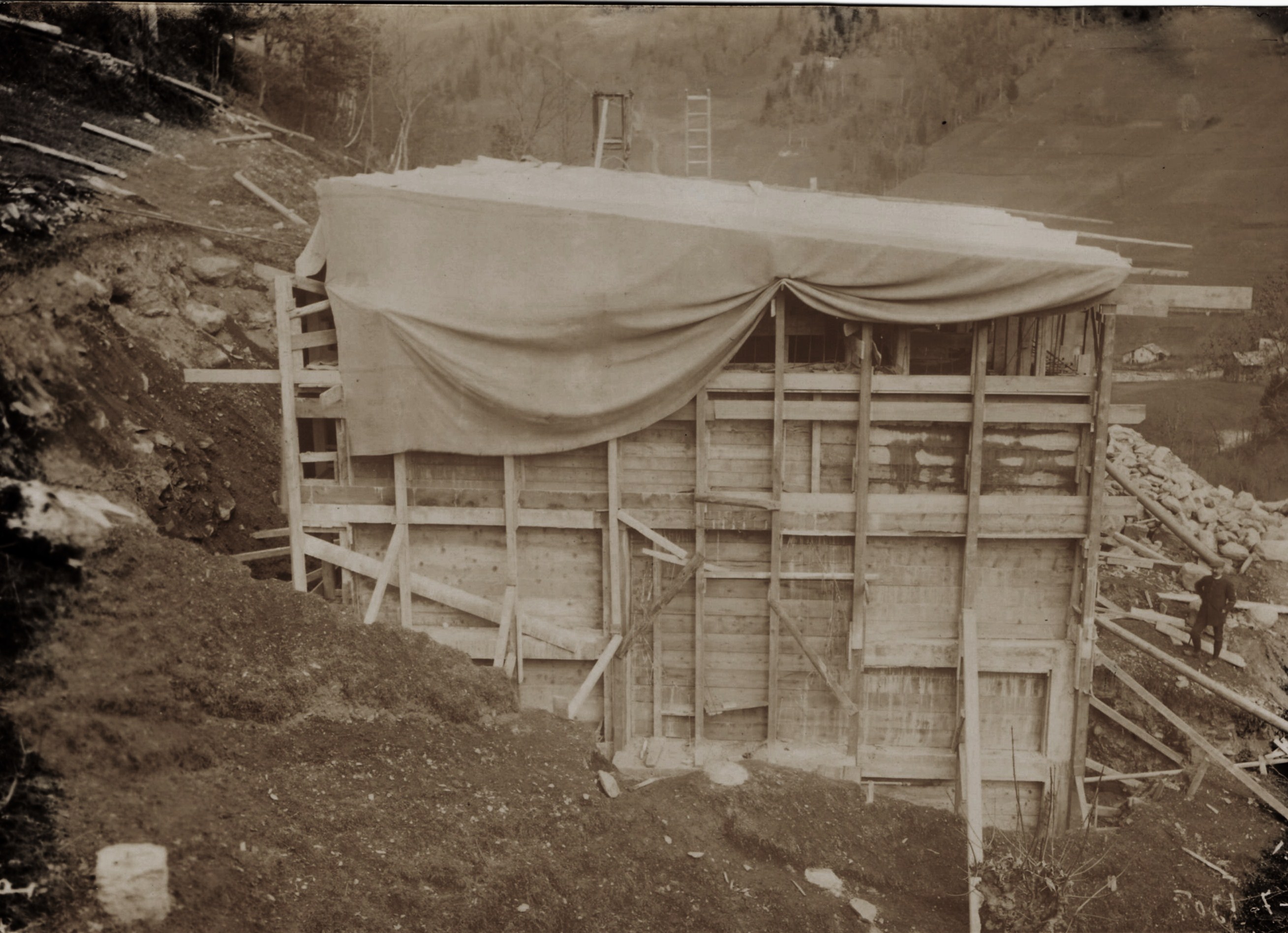 Chantier de la centrale de Pinsot : construction de la chambre de mise en charge du Charvin