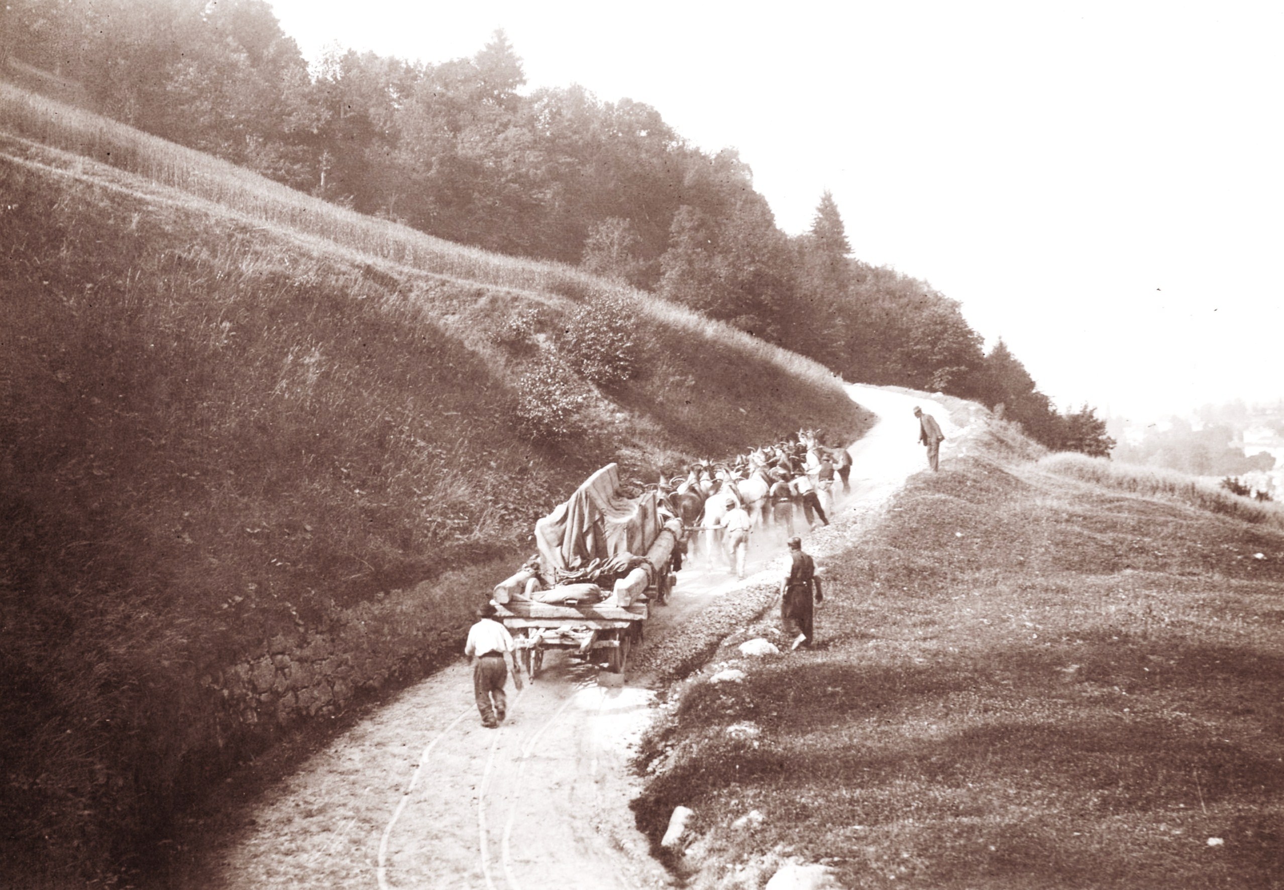Une quinzaine de chevaux tirent la charrette, accompagnés d’une dizaine d’hommes.