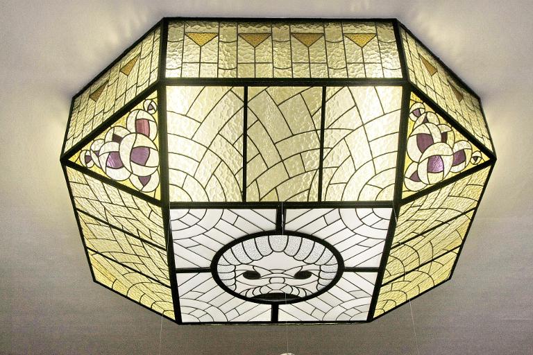 On y voit des tables et des chaises des deux côtés de la pièce. Sur la gauche, le vitrail monumental, et au plafond, les plafonniers Perzel.