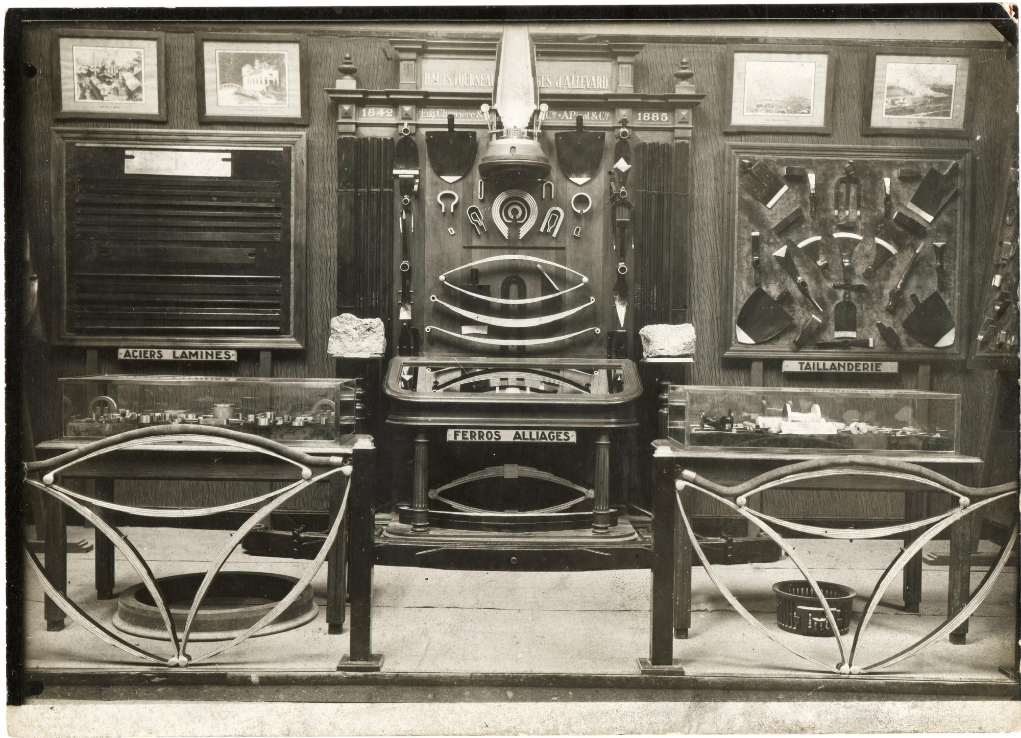 On y trouve des vitrines, présentant les différentes production des Forges d’Allevard : aciers laminés, ferros alliages, taillanderie. Sur la vitrine centrale sont indiquées les mentions « Hauts Fourneaux et Forges d’Allevard », les dates « 1842-1885 » qui correspondent aux dates durant lesquelles Eugène Charrière fut aux commandes de la société.