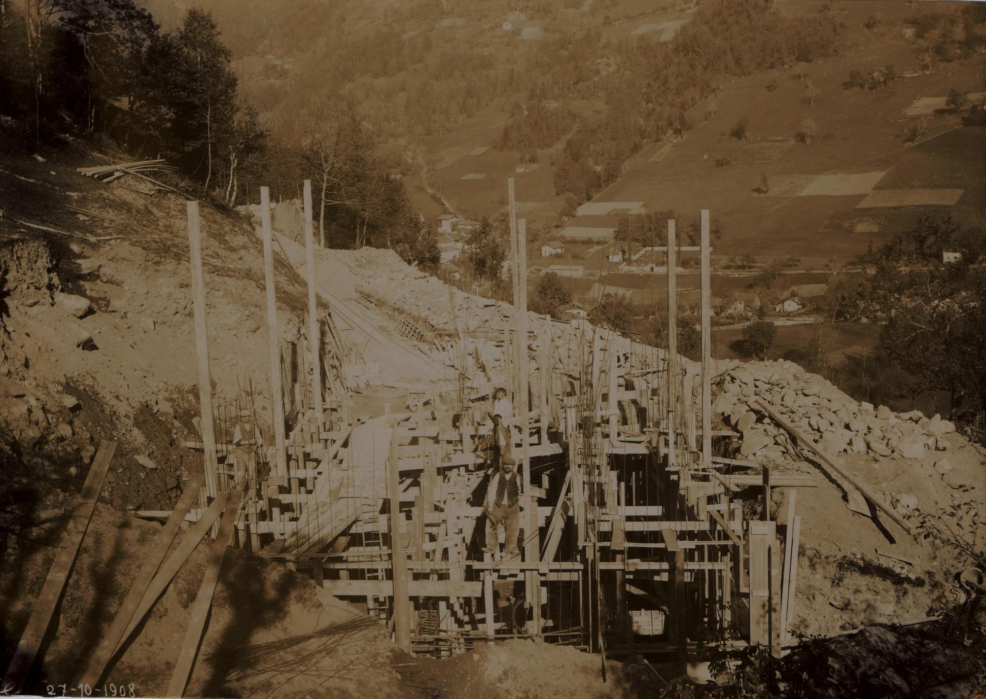 Chantier de construction de la centrale de Pinsot : construction de la chambre de mise en charge du Charvin