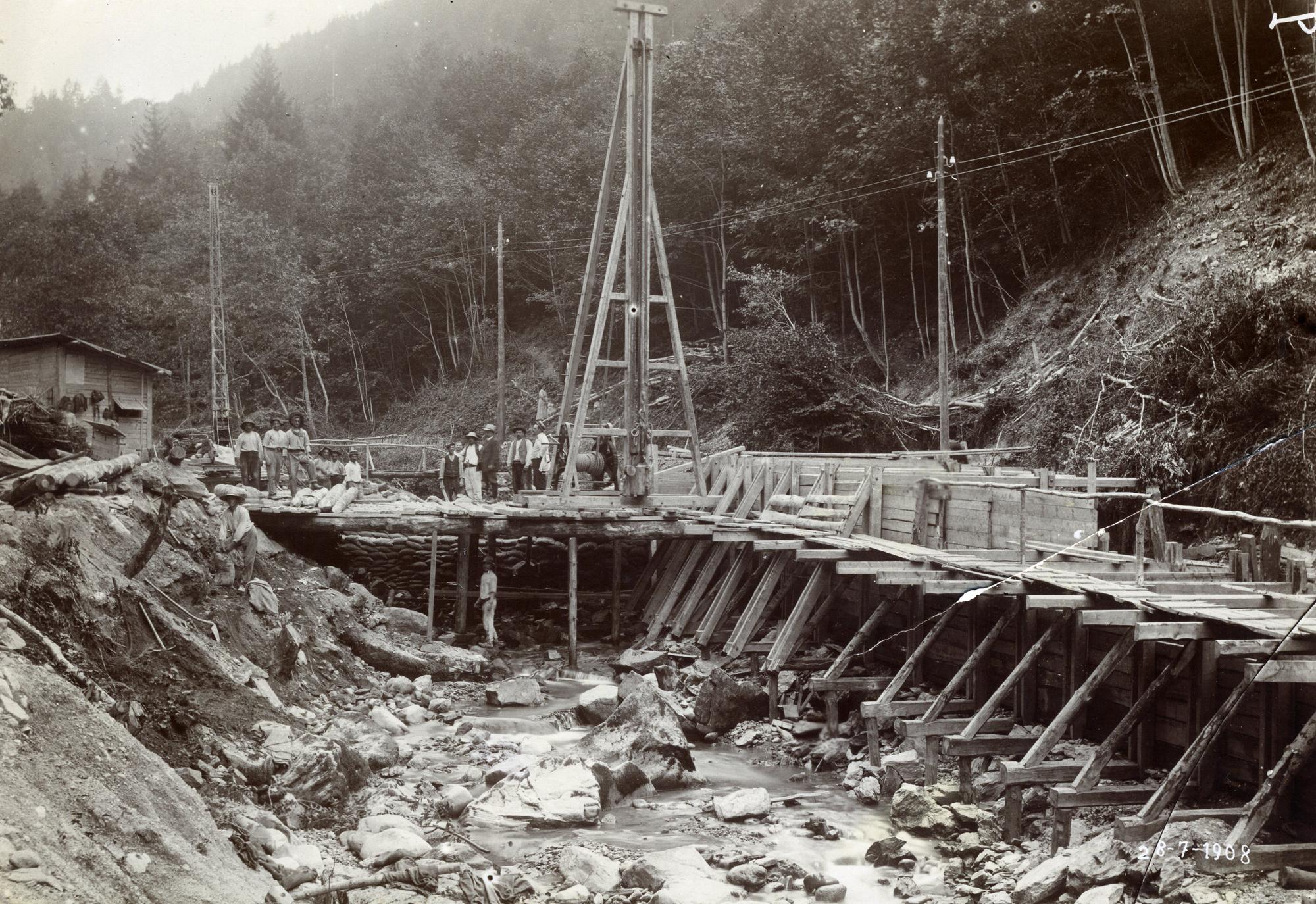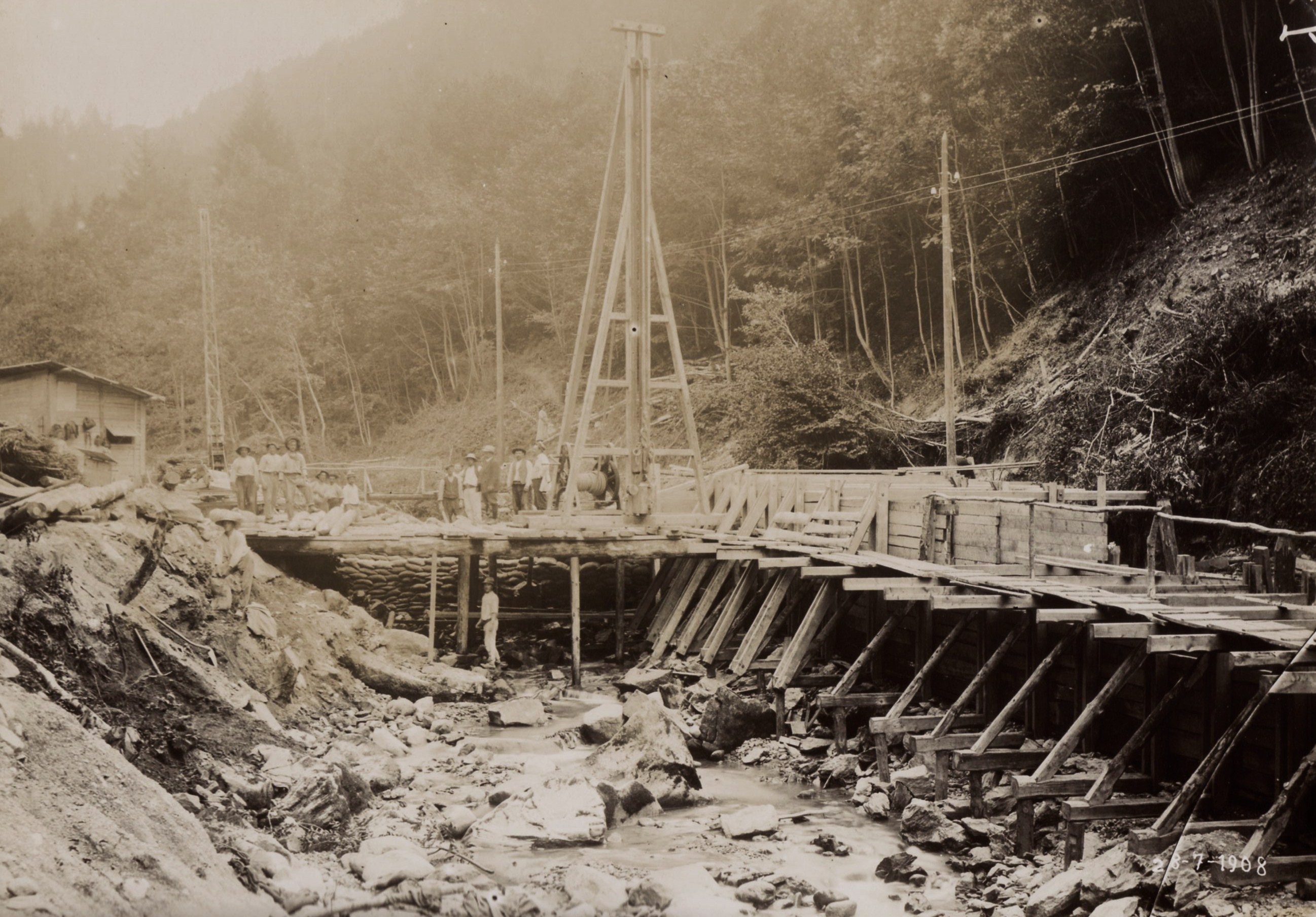 Cette photographie monochrome du début du 20e siècle est une vue du chantier de dérivation du Bréda pour la création de la centrale de Pinsot.
