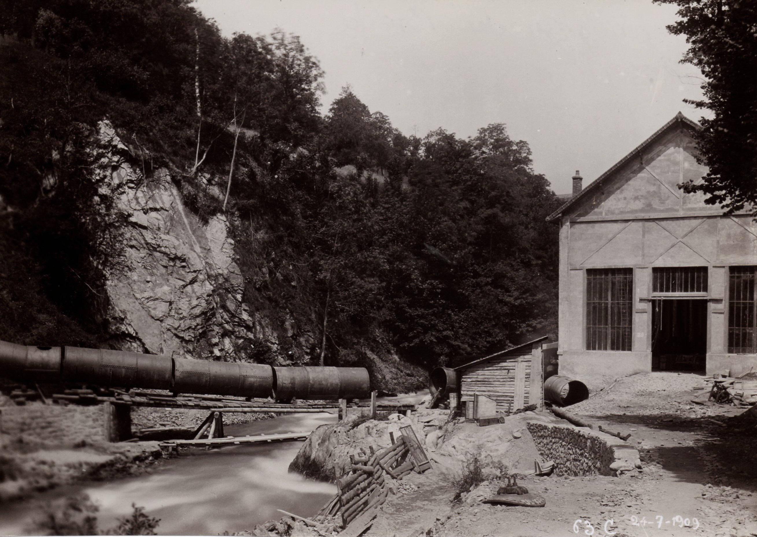 Sur la droite, on voit la centrale ; sur la gauche, la conduite forcée en cours d’installation, passant au-dessus du torrent.