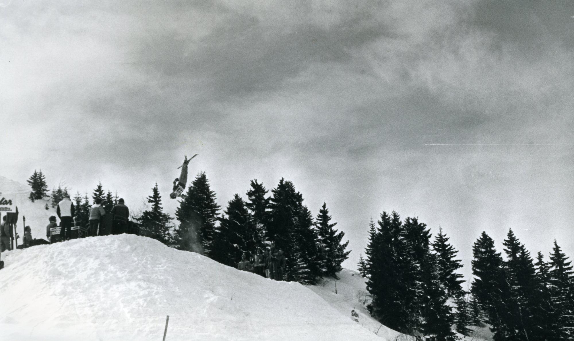 Un skieur effectue un saut sur un tremplin de ski acrobatique (ses skis sont croisés et il semble faire un tour complet, la tête en bas). Il s’agit d’un saut arrière vrillé.