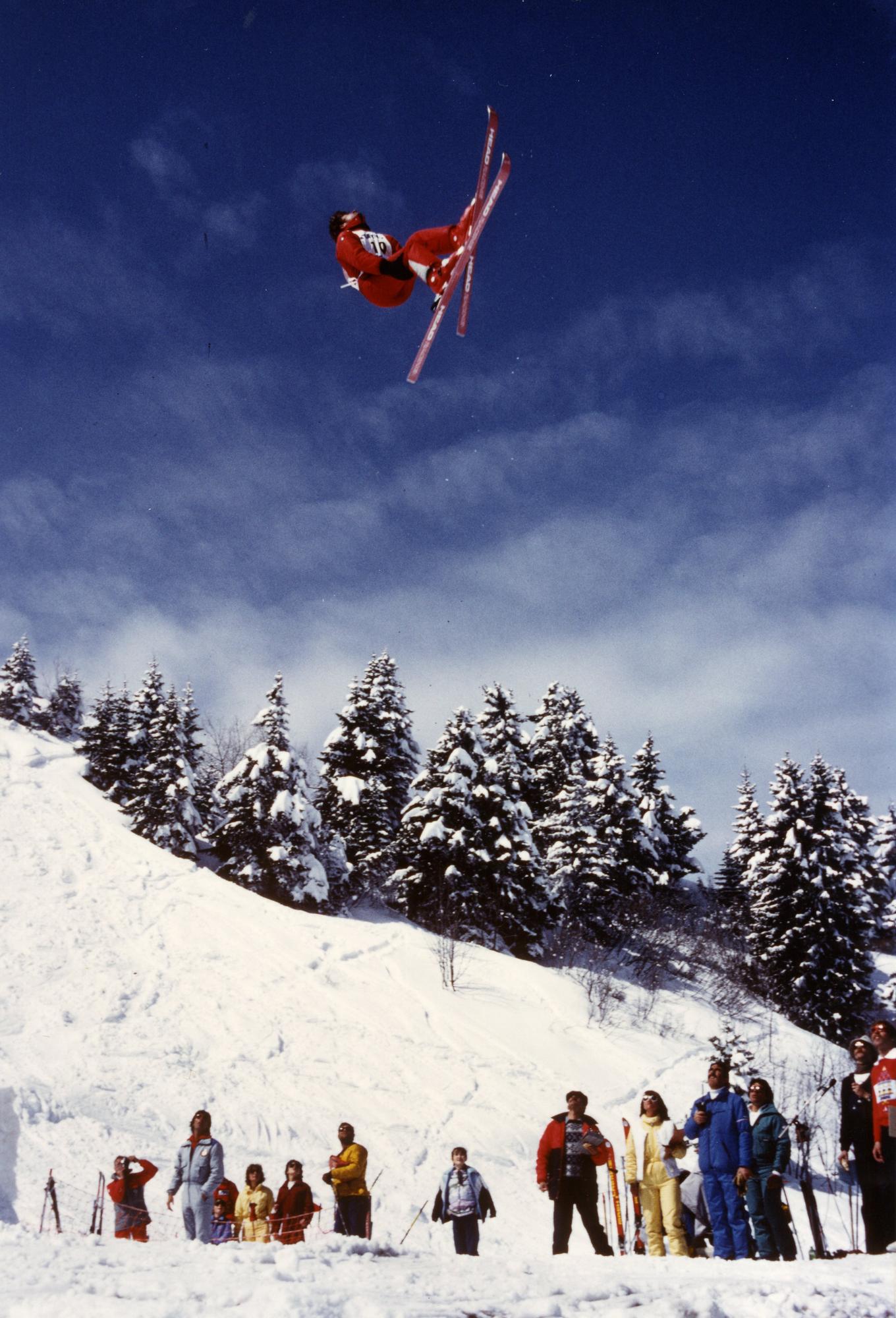 Un skieur vêtu d’une combinaison rouge et d’un dossard (n°10 ?) effectue un saut périlleux arrière groupé sur un tremplin de ski acrobatique. Il porte des skis de la marque « Head »