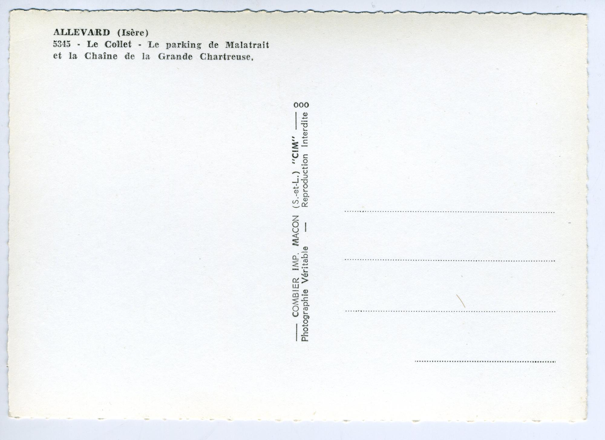 Cette carte postale monochrome est une vue de la station du Collet d’Allevard prise depuis les pistes de ski, donc en hauteur, en hiver. On y voit des skieurs qui descendent les pistes. On aperçoit sur la gauche le téléski de Malatrait, au centre le parking de Malatrait ainsi que le chalet du ski club. Sur la droite, les autres constructions de la station : le télébar, « les rhodos » (en remplacement des « rhododendrons »)