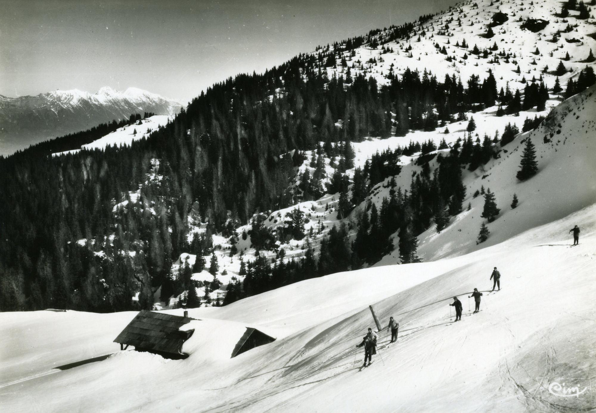 Cette carte postale monochrome est une vue de la station du Collet d’Allevard, en hiver, prise sur les pistes des bergeries. On y voit 7 skieurs sur la droite de la photographie ; et une bergerie sur la gauche. Autour, les sapins