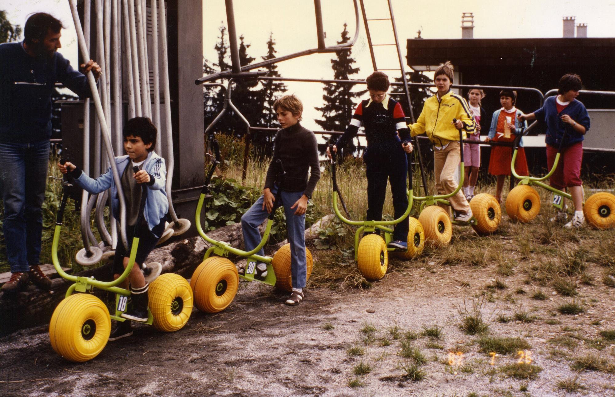 Vue d’un groupe d’enfants s’apprêtant à remonter une piste à bord d’une trottin’herbe, accroché au téléski de Malatrait.