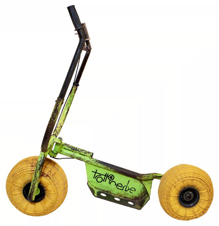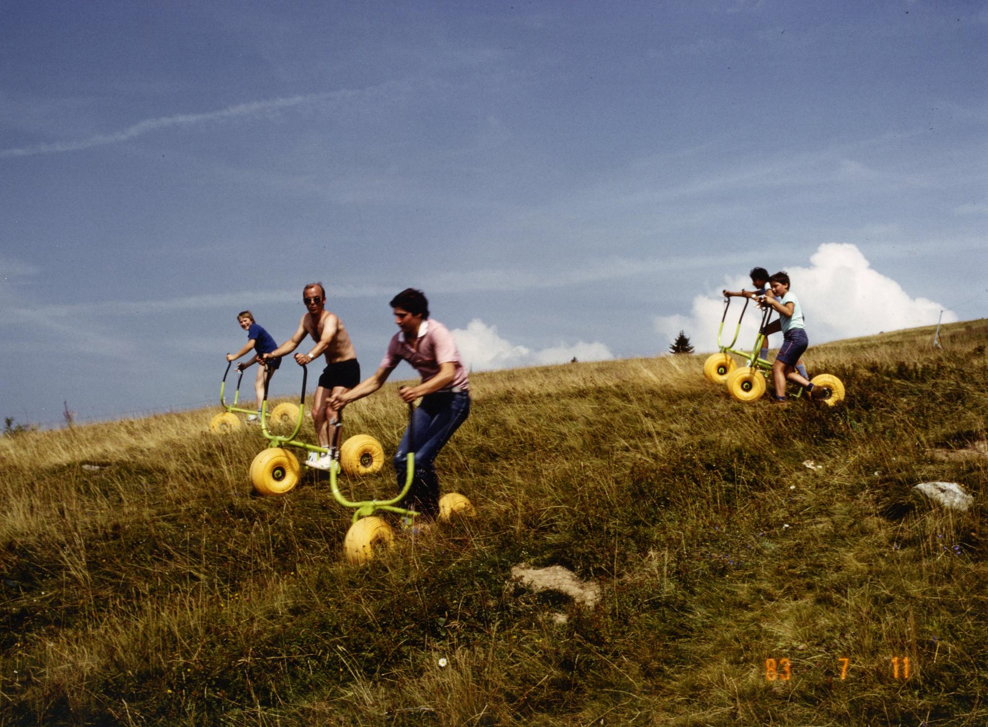 Vue d’un groupe de 5 personnes descendant une piste à bord de trottin’herbes.