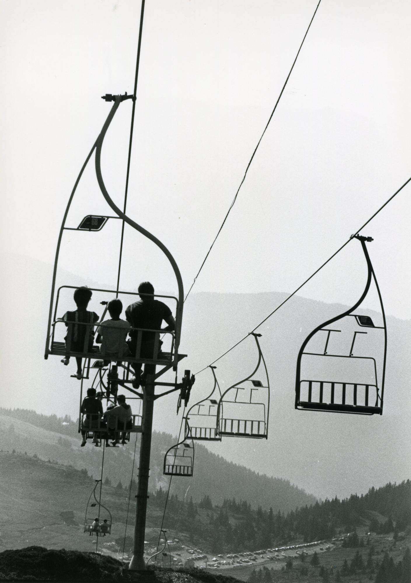 Vue du TS des Plagnes en usage en été. La photographie a très certainement été prise depuis l’un des siège de TS, lors de la redescente : cela offre une vue plongeante sur le plateau du Super Collet.