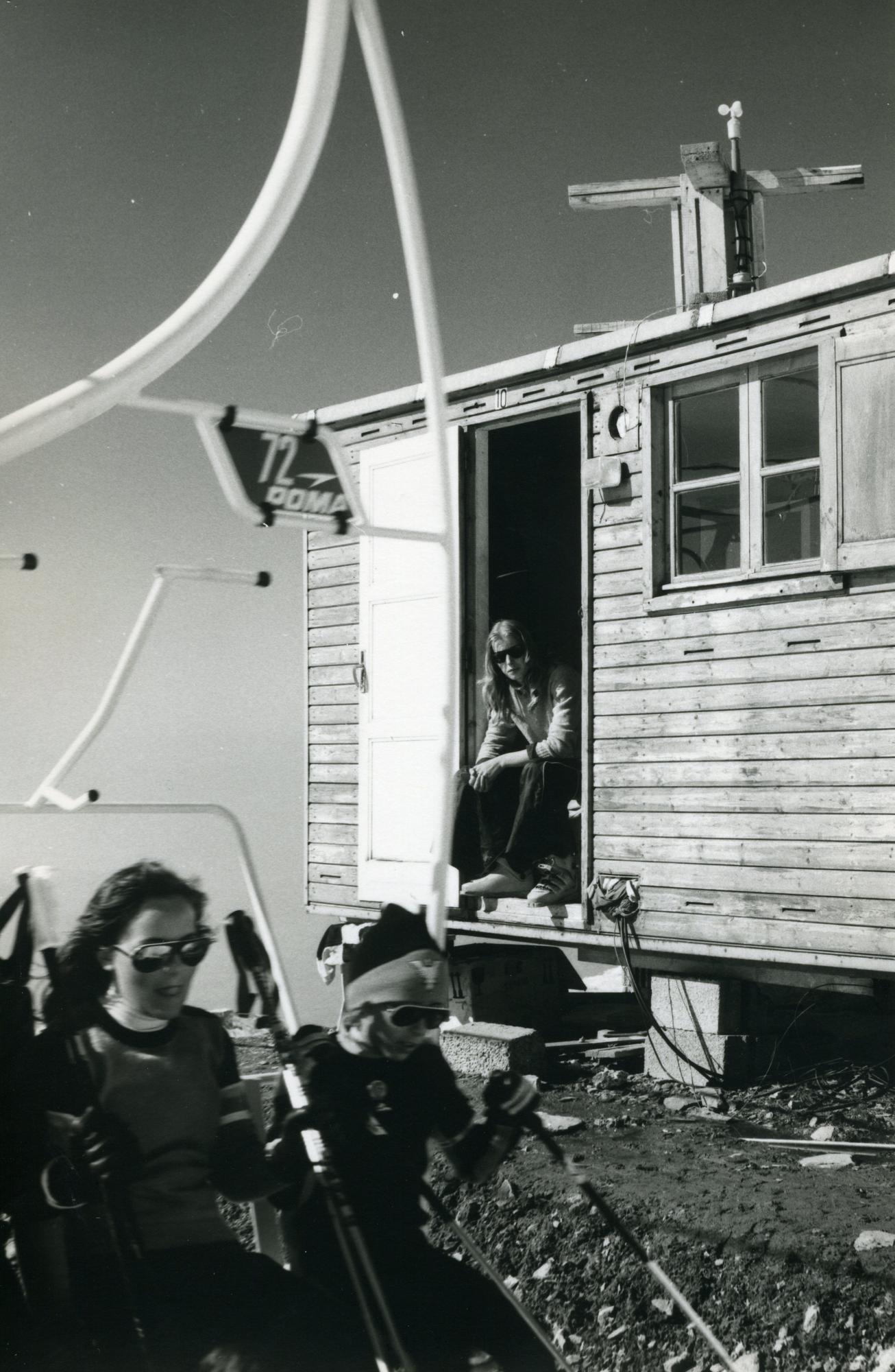 Cette photographie monochrome présente une vue de la gare d’arrivée du télésiège des Plagnes en été. Deux randonneurs s’apprêtent à descendre du télésiège. Ils sont équipés de bâtons. La personne en charge du télésiège est assise dans le cabanon.