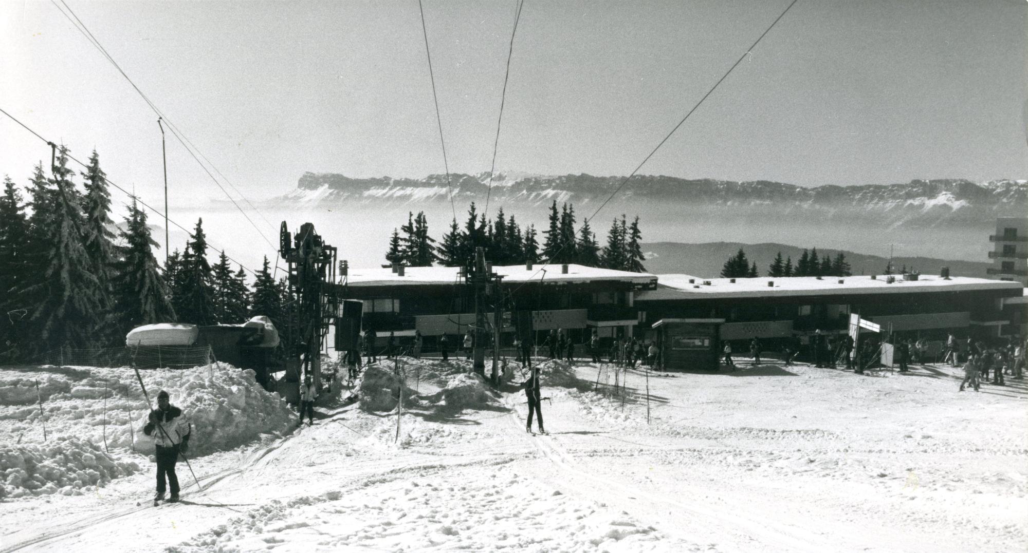 Cette photographie monochrome présente une vue du bas des pistes de Malatrait : des skieurs remontent la piste sur les deux téléskis ; derrière eux, on voit le bâtiment Le Chamois d’or. Au fond, le massif de la Chartreuse.