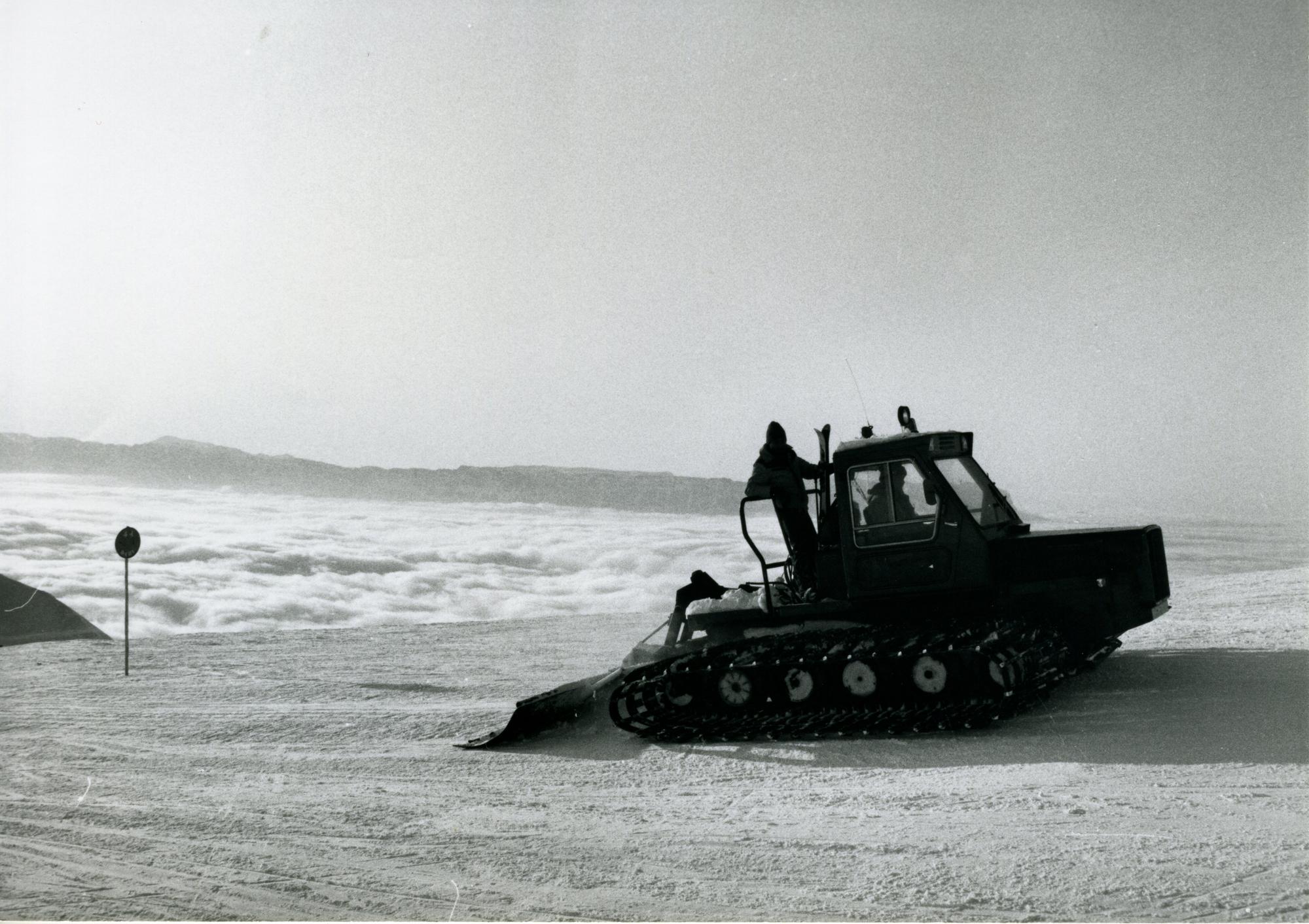 Cette photographie monochrome la vue d’une dameuse sur une piste des hauteurs de la station du Collet. Une personne conduit l’engin, une autre se tient debout à l’arrière. Derrière eux, la mer de nuages et le massif de la Chartreuse.