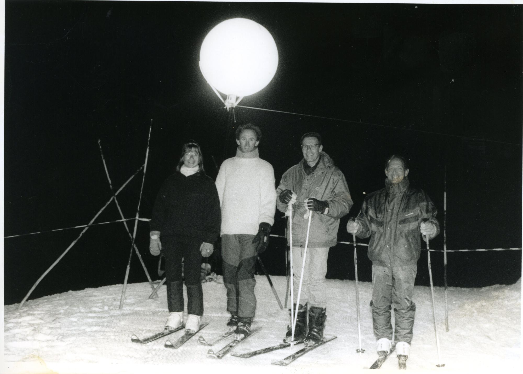 Cette photographie monochrome présente la vue de 4 personnes (trois hommes et une femme) chaussés de skis à l’occasion d’une « nocturne » au Collet d’Allevard. Ils se tiennent alignés, devant une source de lumière, et prennent la pose pour la photographie (ils regardent l’objectif).