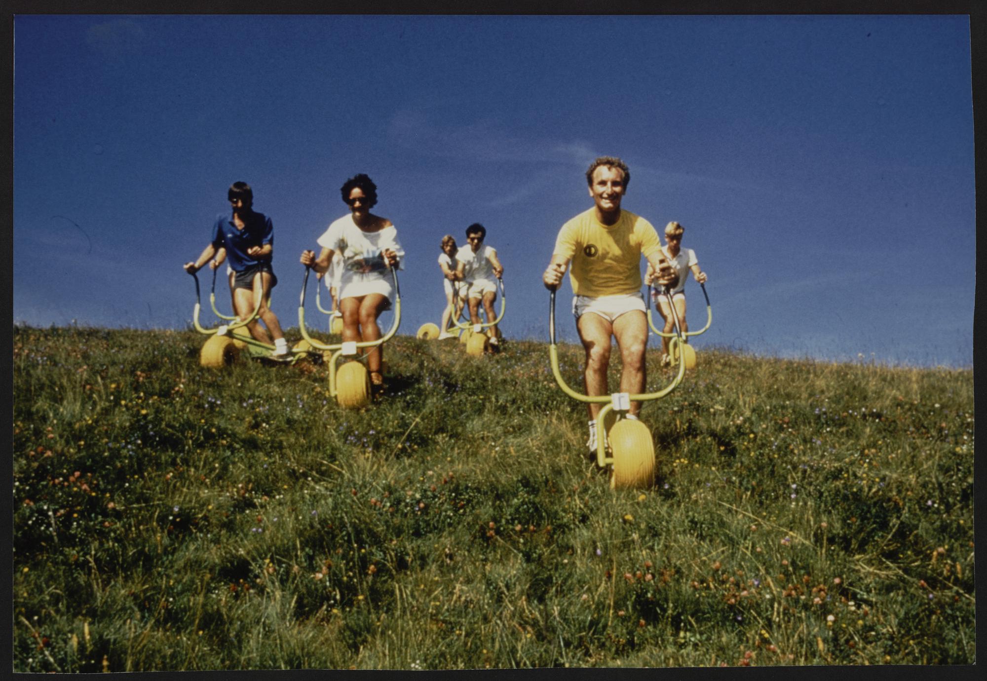 Vue d’un groupe descendant une piste à bord de trottin’herbes.