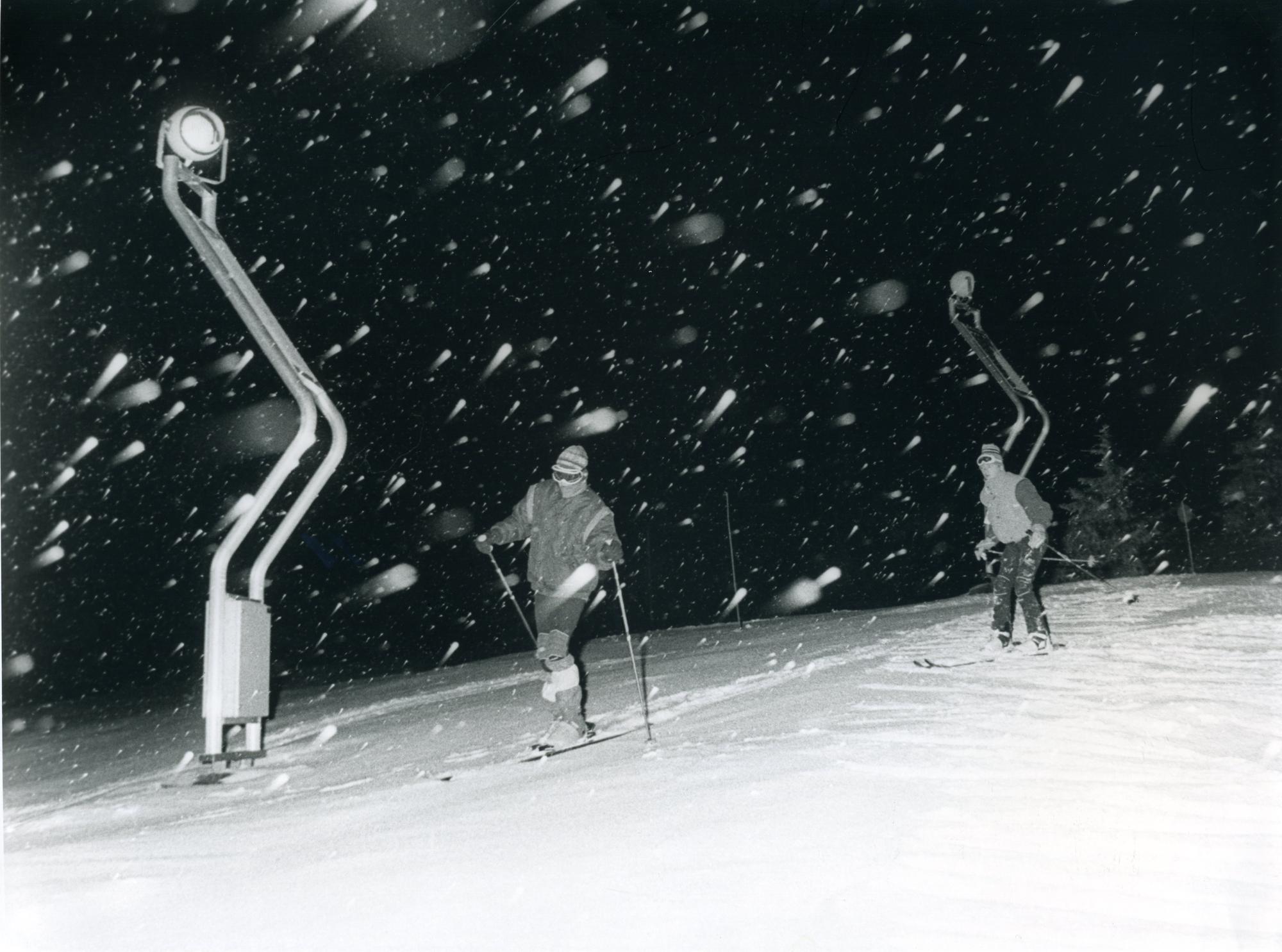 Cette photographie monochrome présente la vue d’une piste du Collet d’Allevard éclairée à l’occasion de la « nocturne ». On y voit deux skieurs. On remarque également 2 « lampaneiges », les systèmes d’éclairage utilisés dans les débuts du ski nocturne, et qui fonctionnaient à l’énergie solaire.