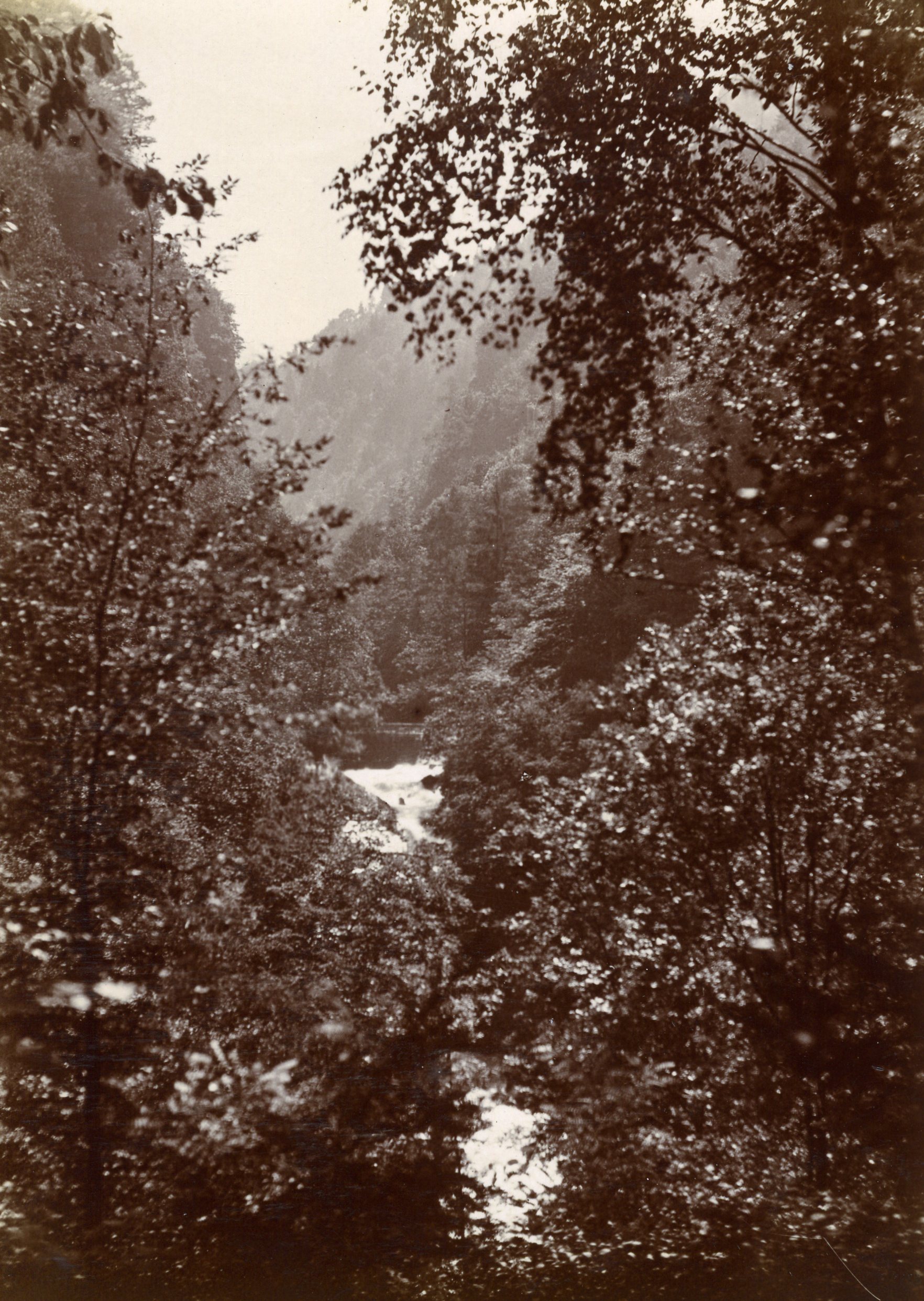 Il s’agit d’une vue générale de la gorge du Bout du Monde : on devine entre les arbres le torrent du Bréda et les montagnes environnantes.