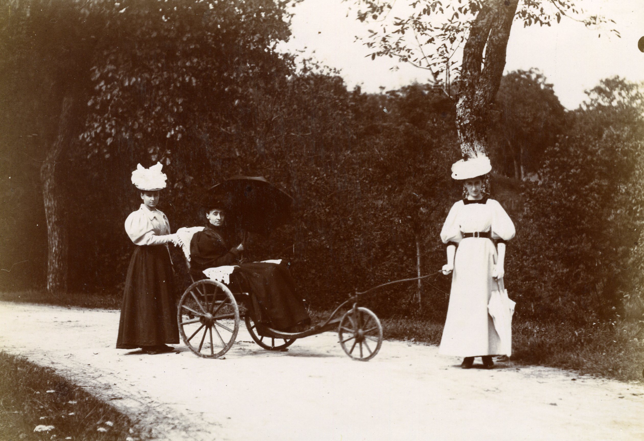Il s’agit de la vue d’une dame installée sur un fauteuil disposant de 3 roues (2 grandes à l’arrière et une petite à l’avant), et tenant une ombrelle. Elle est accompagnée de 2 jeunes filles, élégamment vêtues, l’une tenant ce qui semble être la direction de l’engin, et l’autre se tenant derrière ce fauteuil.