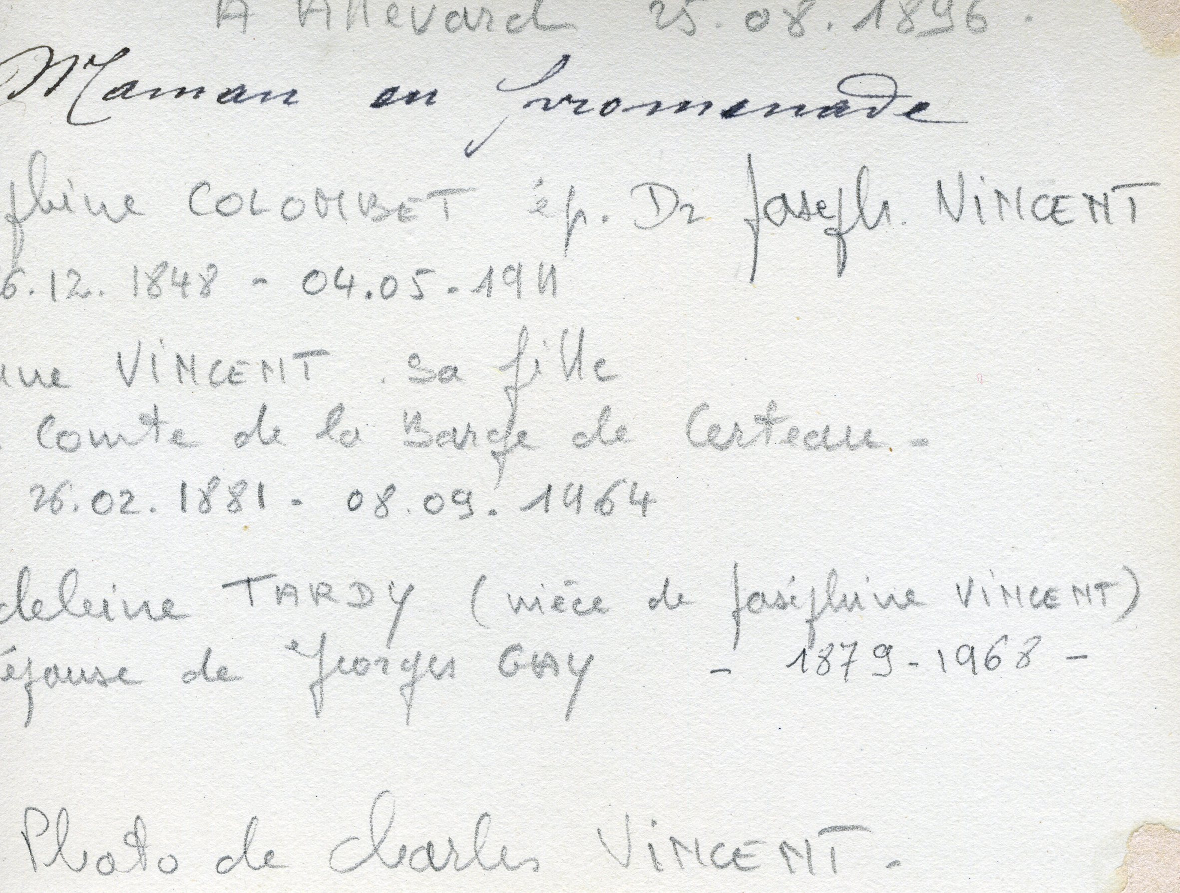 Au revers, des inscriptions nous renseignent sur l’auteur de la photographie, les personnes qui y figurent (la mère, la sœur et la cousine du photographe) et la date à laquelle elle a été prise.
