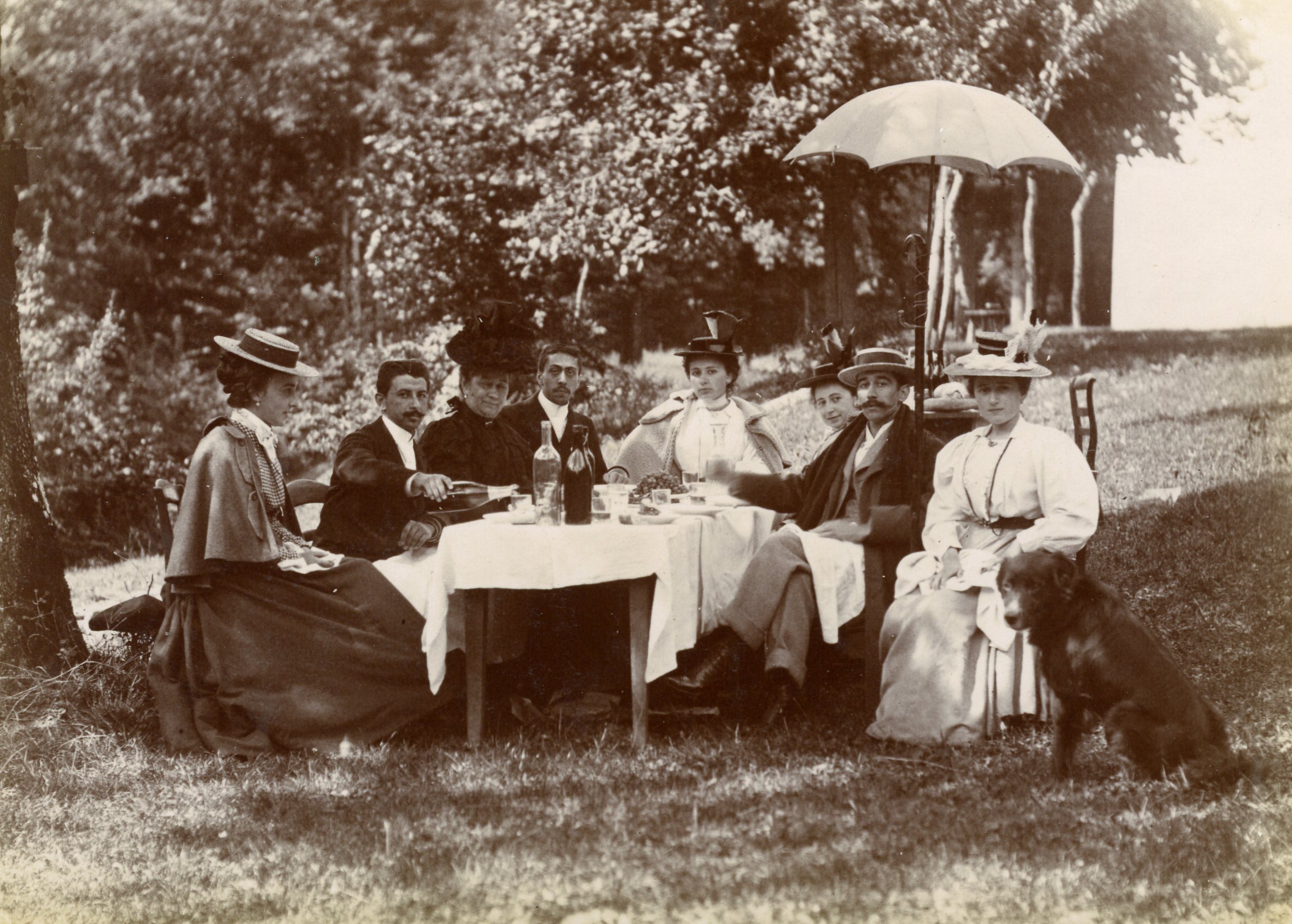 Il s’agit de la vue d’un groupe de 8 personnes, accompagnés d’un chien, attablés dans l’herbe. Ils sont richement vêtus, certains sont abrités par une ombrelle. Un homme sert du vin.