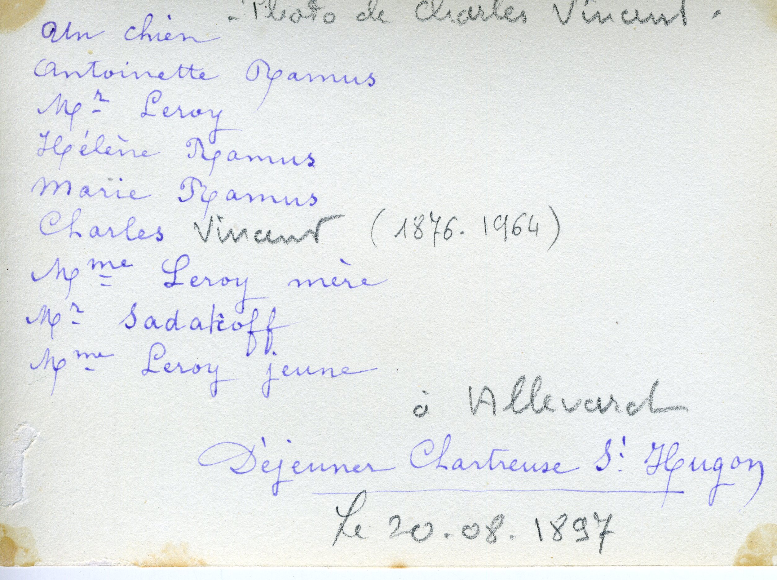 À noter : il est indiqué au revers que la photographie a été prise par Charles Vincent. Cette information est erronée puisque ce dernier apparaît sur la photographie.