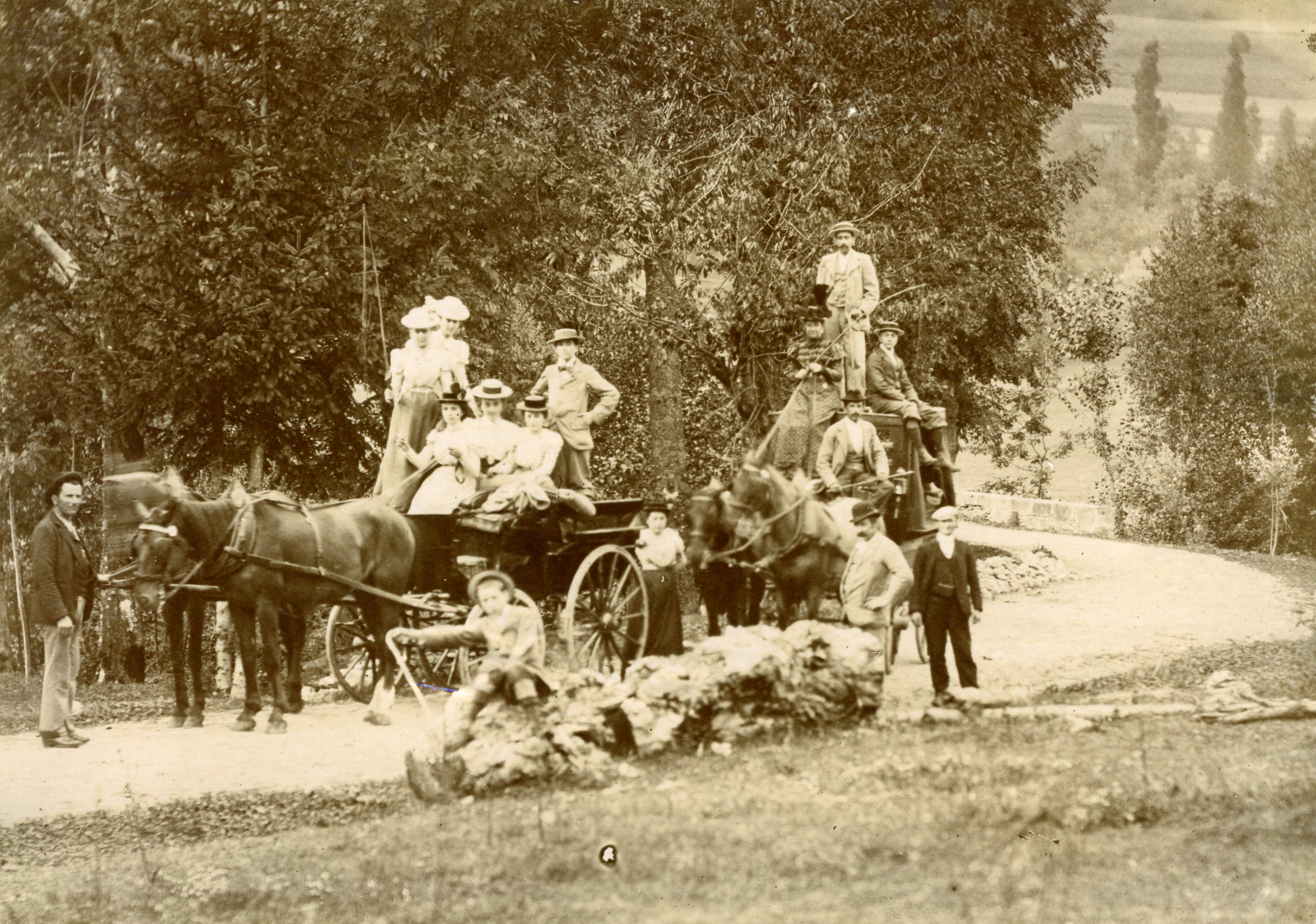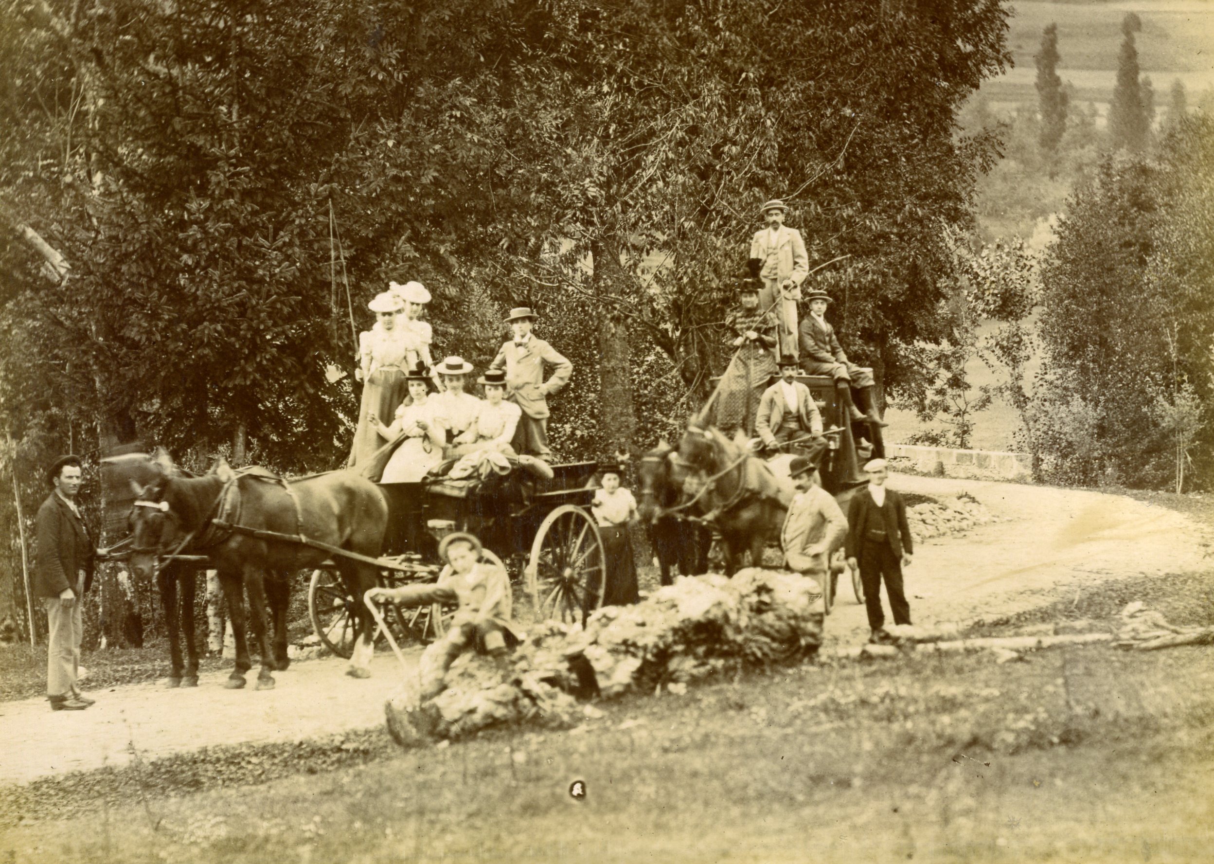 Il s’agit de la vue d’un groupe d’une dizaine de personnes, qui pose pour la photographie. Ils se tiennent autour et sur deux voitures tirées par des chevaux. Ils sont richement vêtus : chapeaux, belles robes, costumes.
