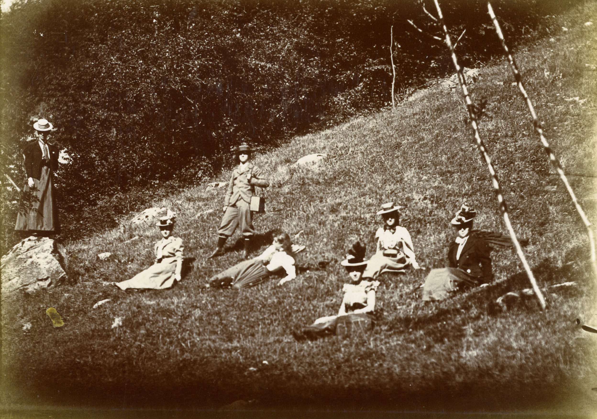 Il s’agit de la vue d’un groupe de 7 personnes (6 femmes et 1 hommes se tiennent dans l’herbe, sur une pente. 5 femmes sont assises par terre, une femme et un homme se tiennent debout. L’homme semble porter un appareil photographique (sorte de sacoche). Ils portent des chapeaux type canotier.