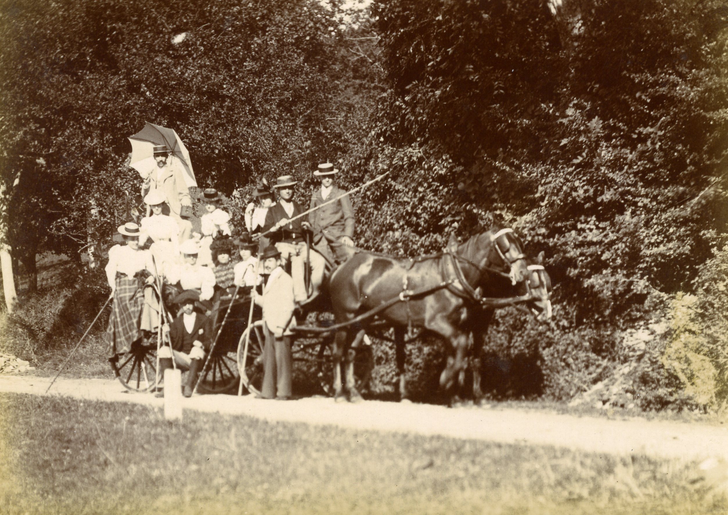 Il s’agit de la vue d’un groupe d’une dizaine de personnes pose pour la photographie. Ils se tiennent autour de deux voitures tirées par des chevaux. Ils sont richement vêtus : chapeaux, belles robes, costumes. La majorité d’entre-eux porte des chapeaux de type canotier.