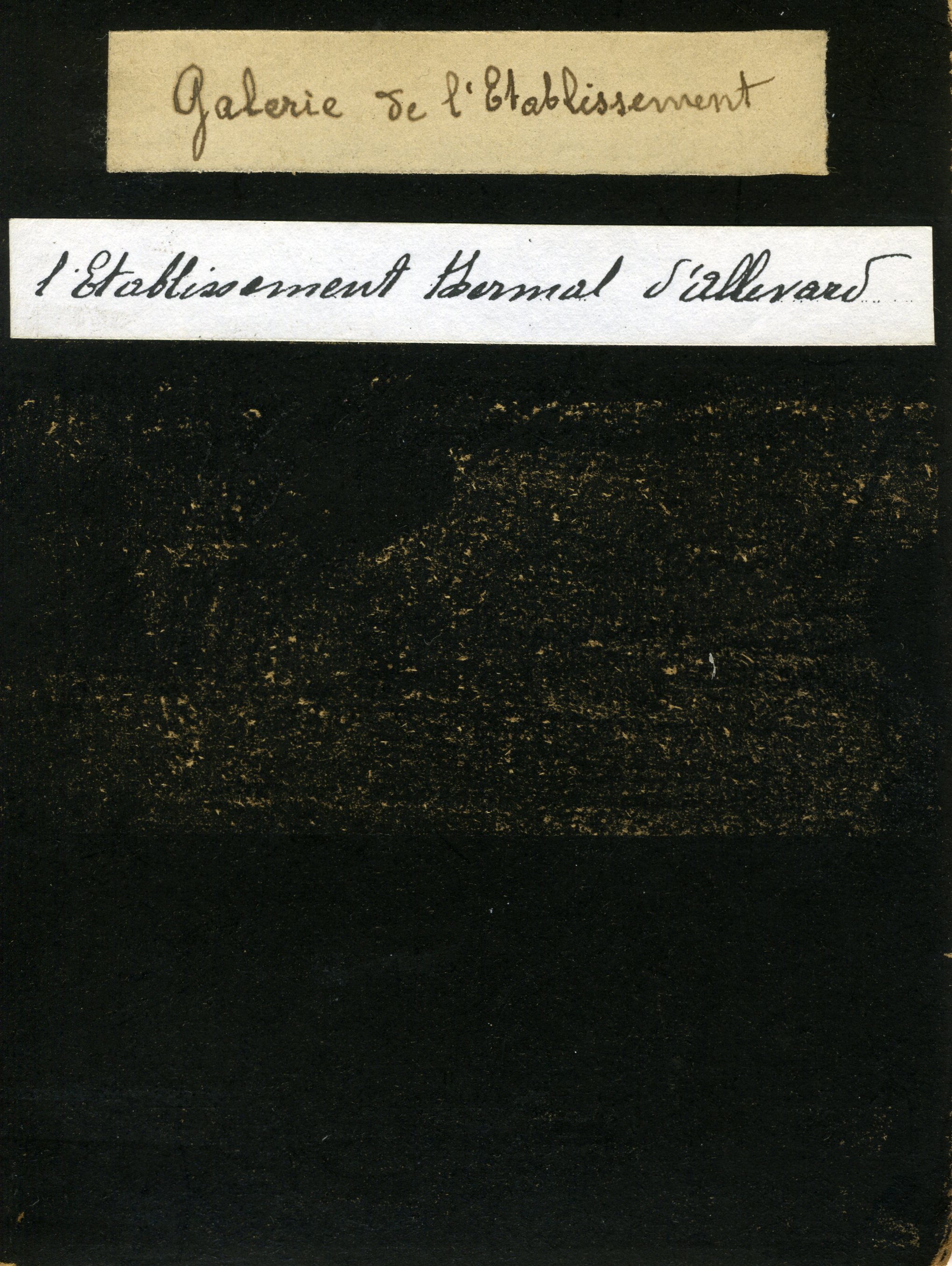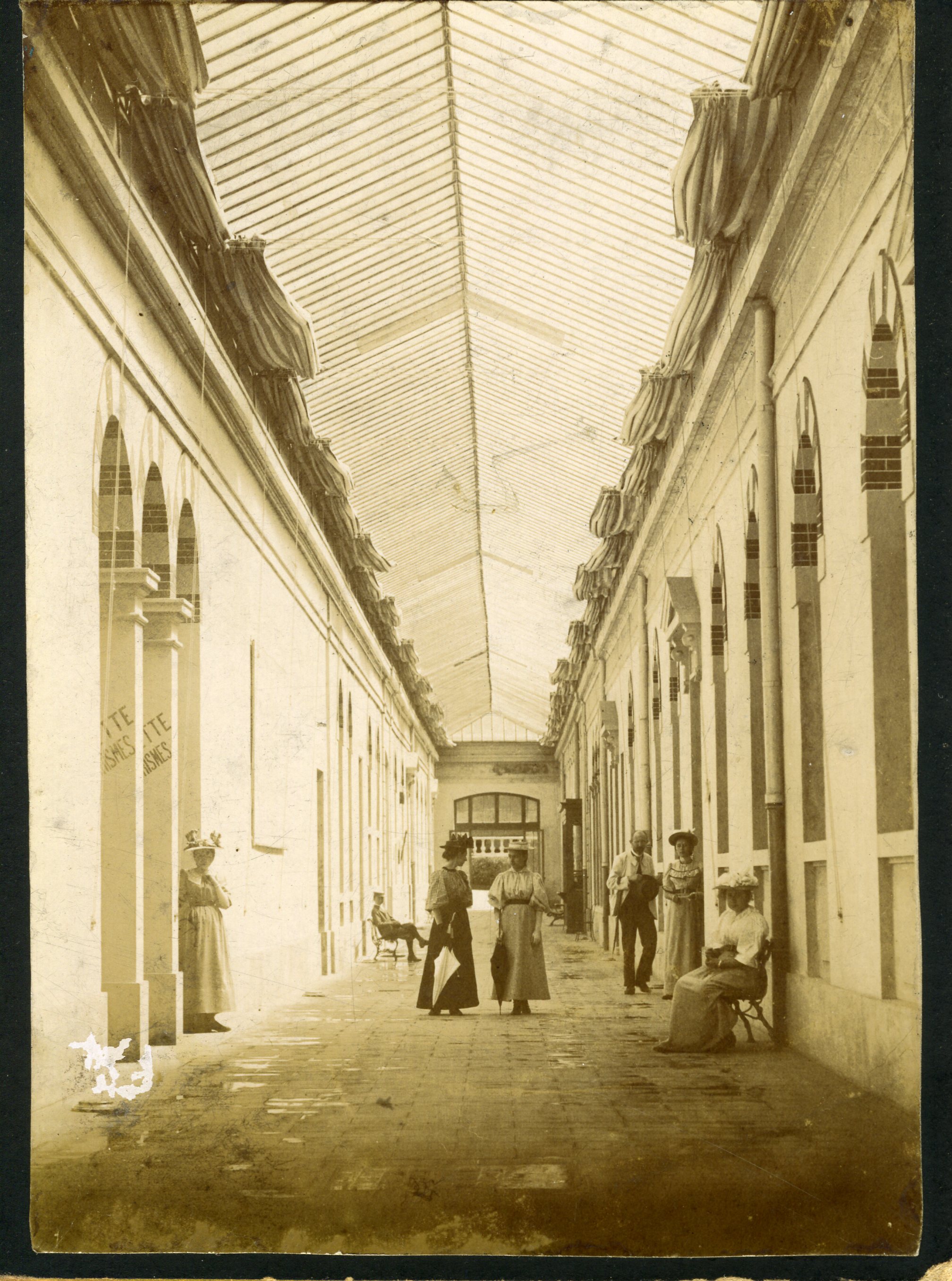 Il s’agit d’une vue prise dans la galerie du bâtiment Nièpce. Plusieurs curistes se tiennent dans cette galerie : deux femmes sont debout, au centre, munies d’ombrelles et portant un canotier. Sur les côté, hommes et femmes, assis ou debout, regardent l’objectif. Les rideaux de la verrière sont ouverts. Sur la gauche, on aperçoit des inscriptions sur les murs : « TTE / ISMES » pour « buvette » et « gargarismes »