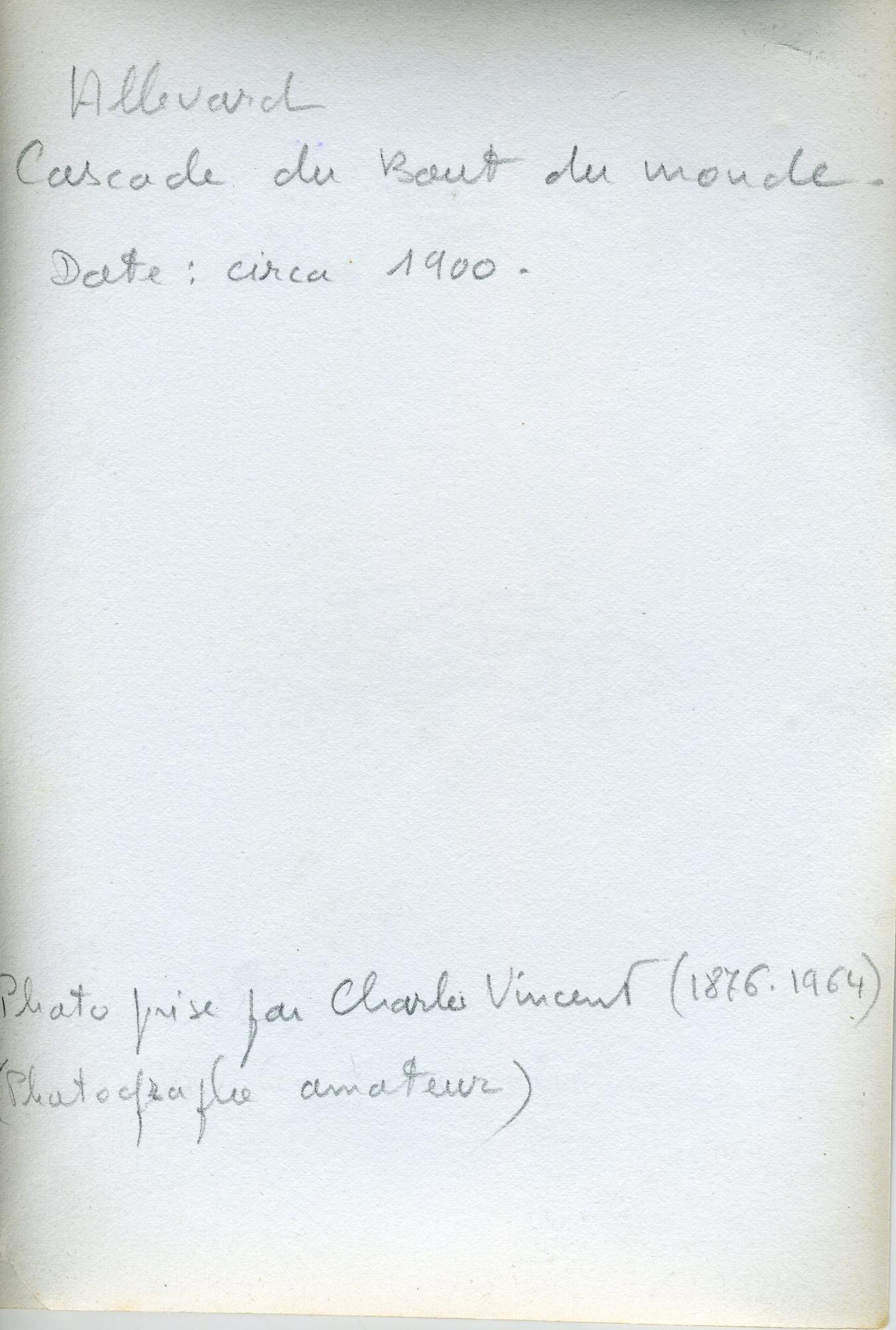 Il s’agit d’une vue d’une cascade. Au revers, il est indiqué que la photographie a été prise au Bout du monde, toutefois cette information semble erronée.