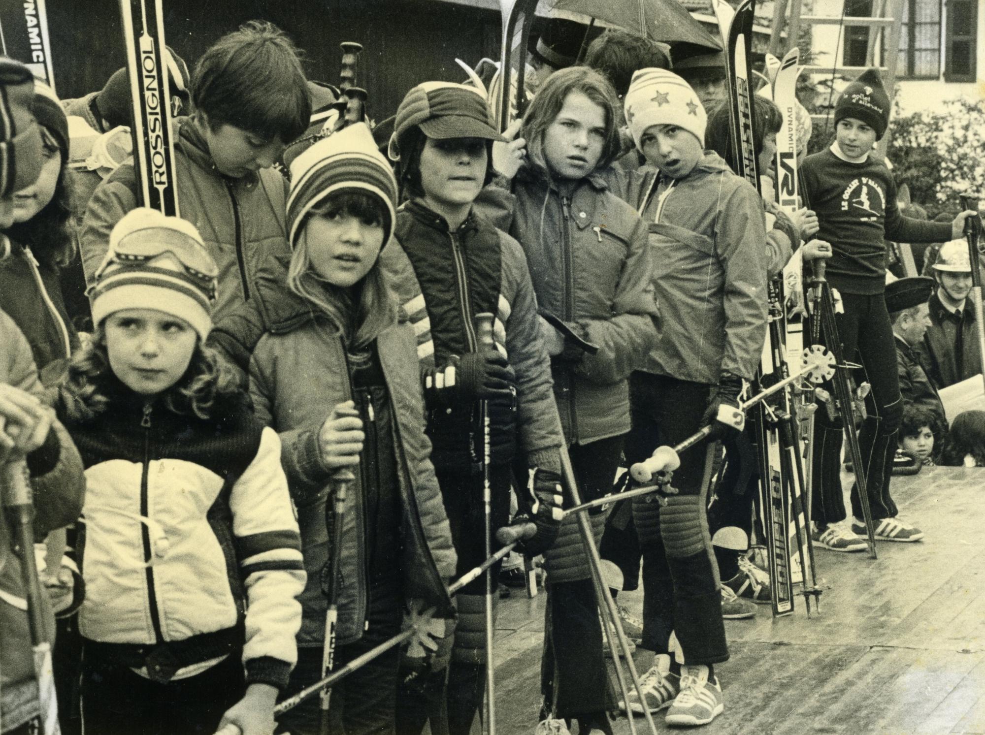 Photographie monochrome présentant des enfants en tenue de ski et équipés et matériel patienter. Certains regardent l’objectif.
