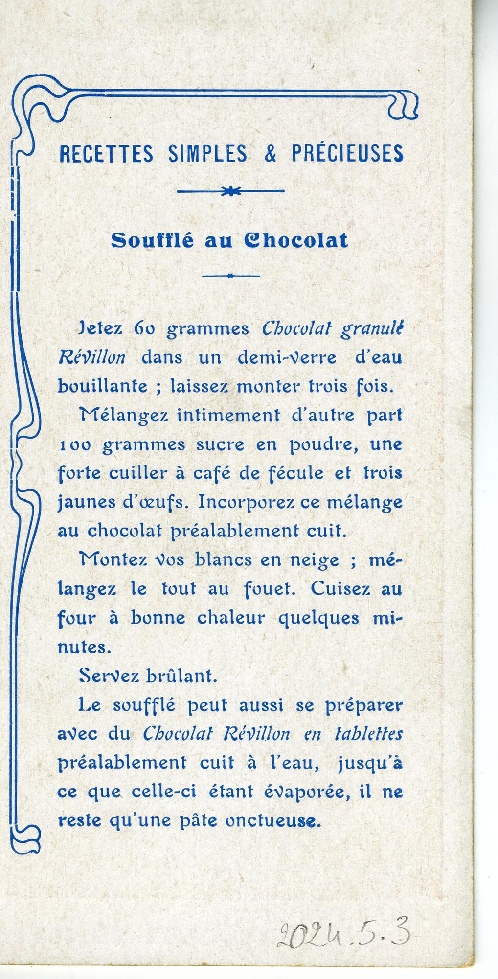Au dos, une recette de soufflé au chocolat met en valeur les produits Révillon.