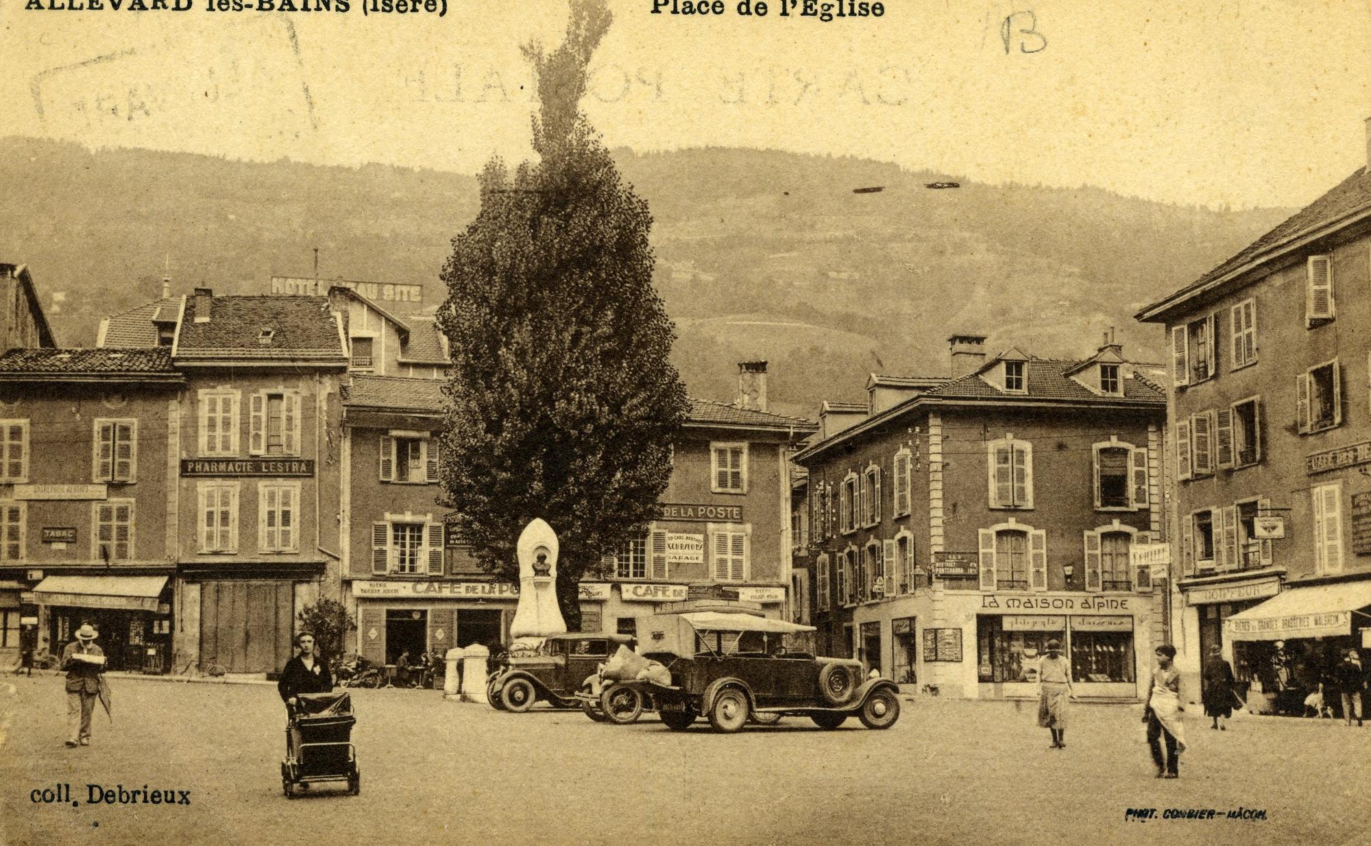 Cette carte postale monochrome est une vue de la place de l’église d’Allevard. On reconnait de nombreux commerces : La Maison Alpine, le Café de la Poste, le Café des Beaux-Arts, ainsi qu’un coiffeur, un tabac et une pharmacie. Le buste de Rambaud est encore sur la place, au pied d’un grand arbre. Deux voitures sont garées, des habitants se promènent.