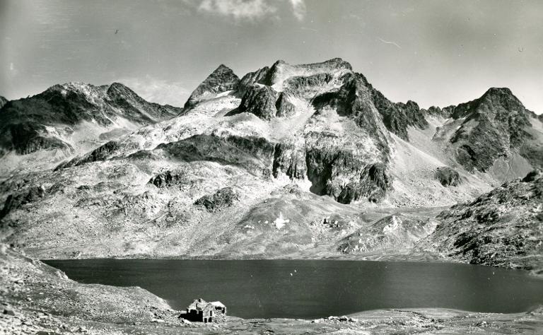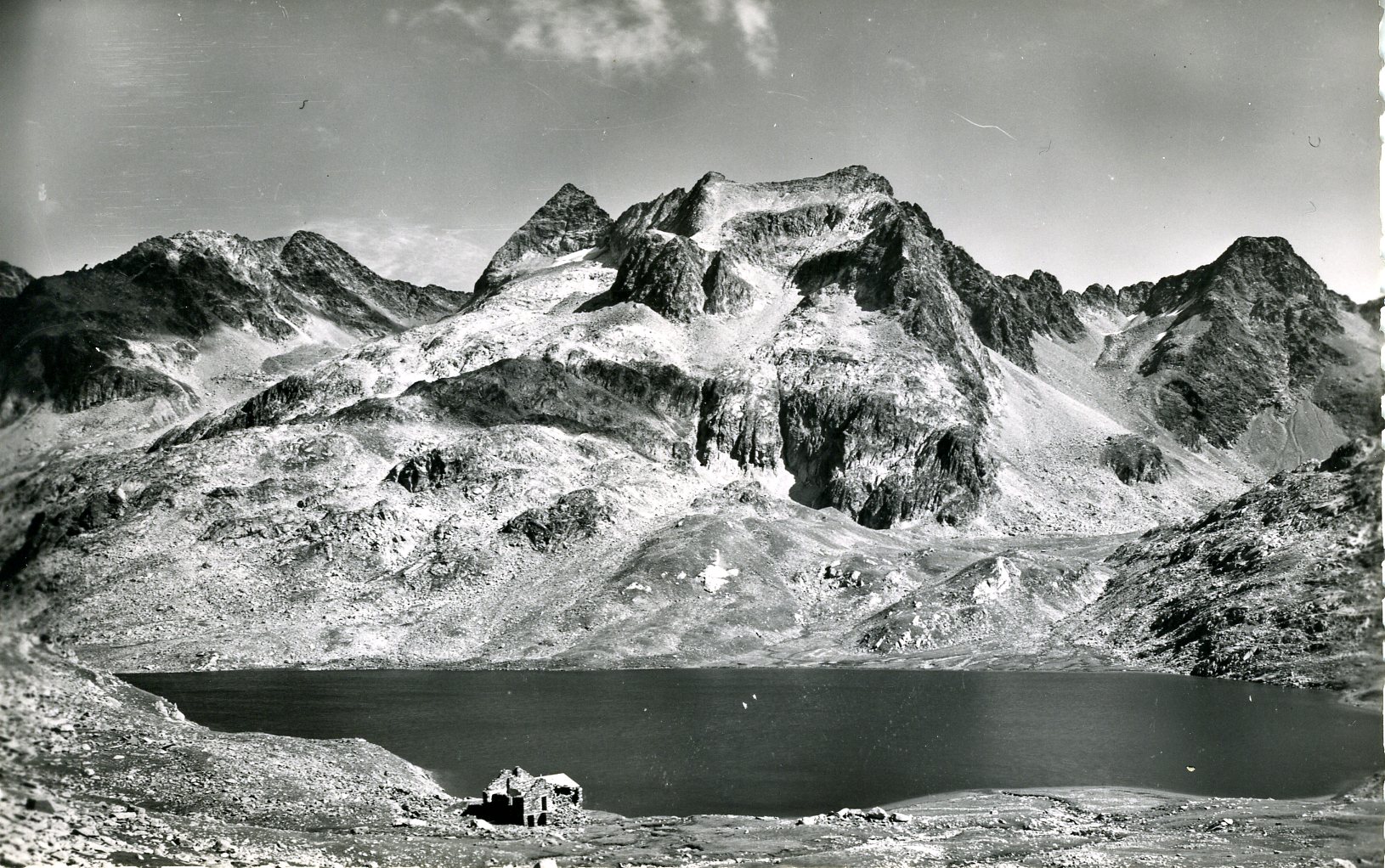 Cette carte postale monochrome aux bords crantés présente la vue d’un paysage de montagnes. Il s’agit du lac du Cos, l’un des lacs des Sept Laux, situés au cœur de la Chaîne de Belledonne. Cette carte postale n’a pas circulé.