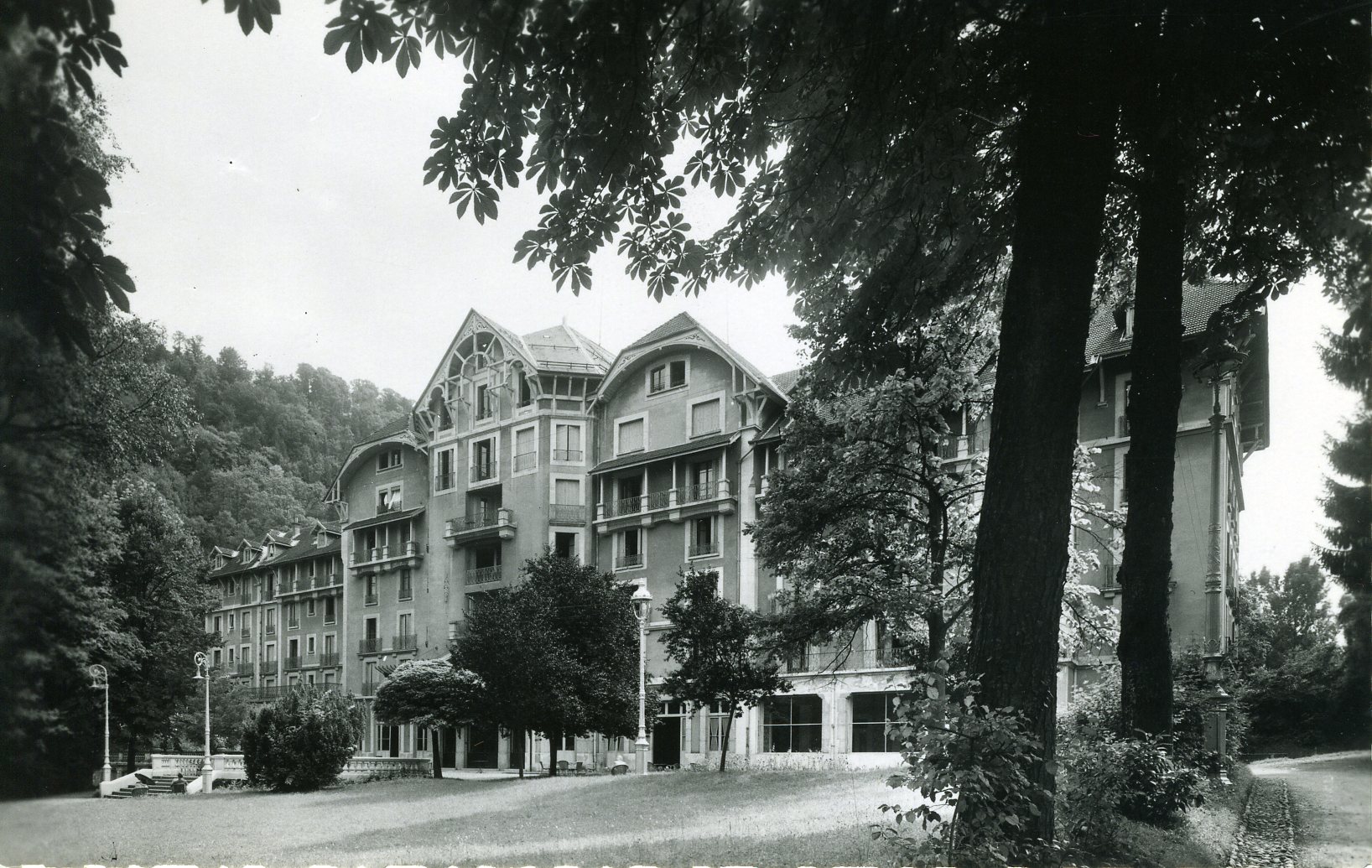 Cette carte postale monochrome aux bords crantés présente une vue de la façade de l’hôtel Splendid, donnant sur le Parc thermal. Cette carte postale n’a pas circulé.