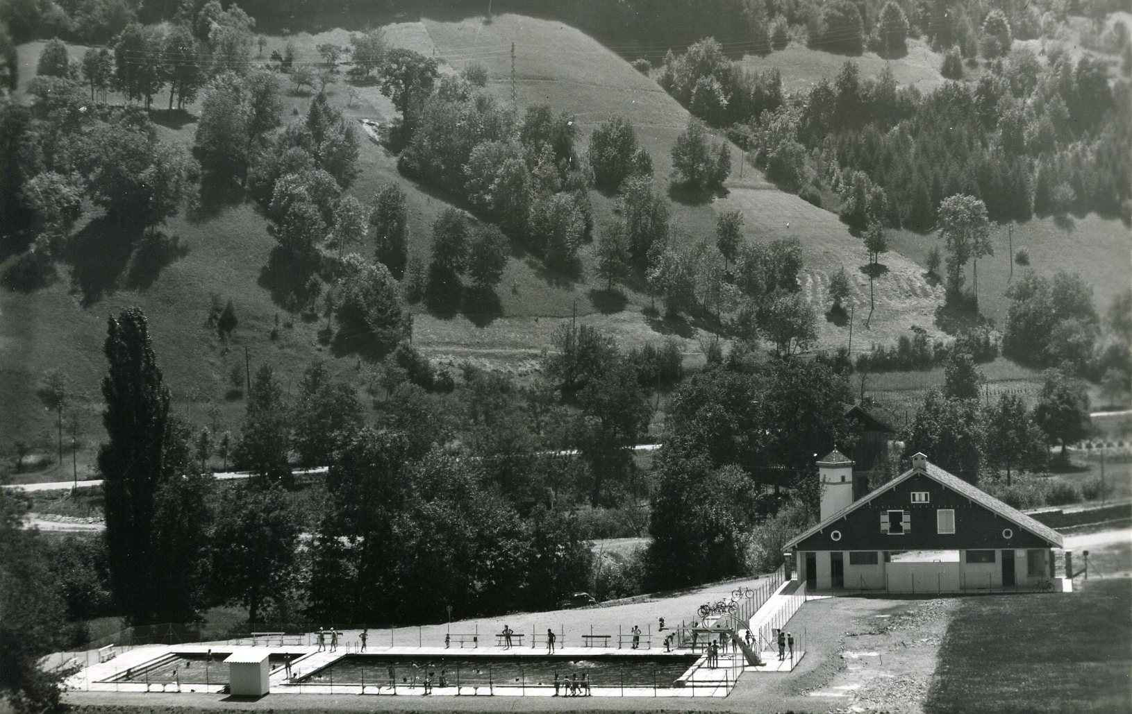 Cette carte postale monochrome aux bords crantés présente une vue de la piscine municipale nouvellement construite. Cette carte postale n’a pas circulé.