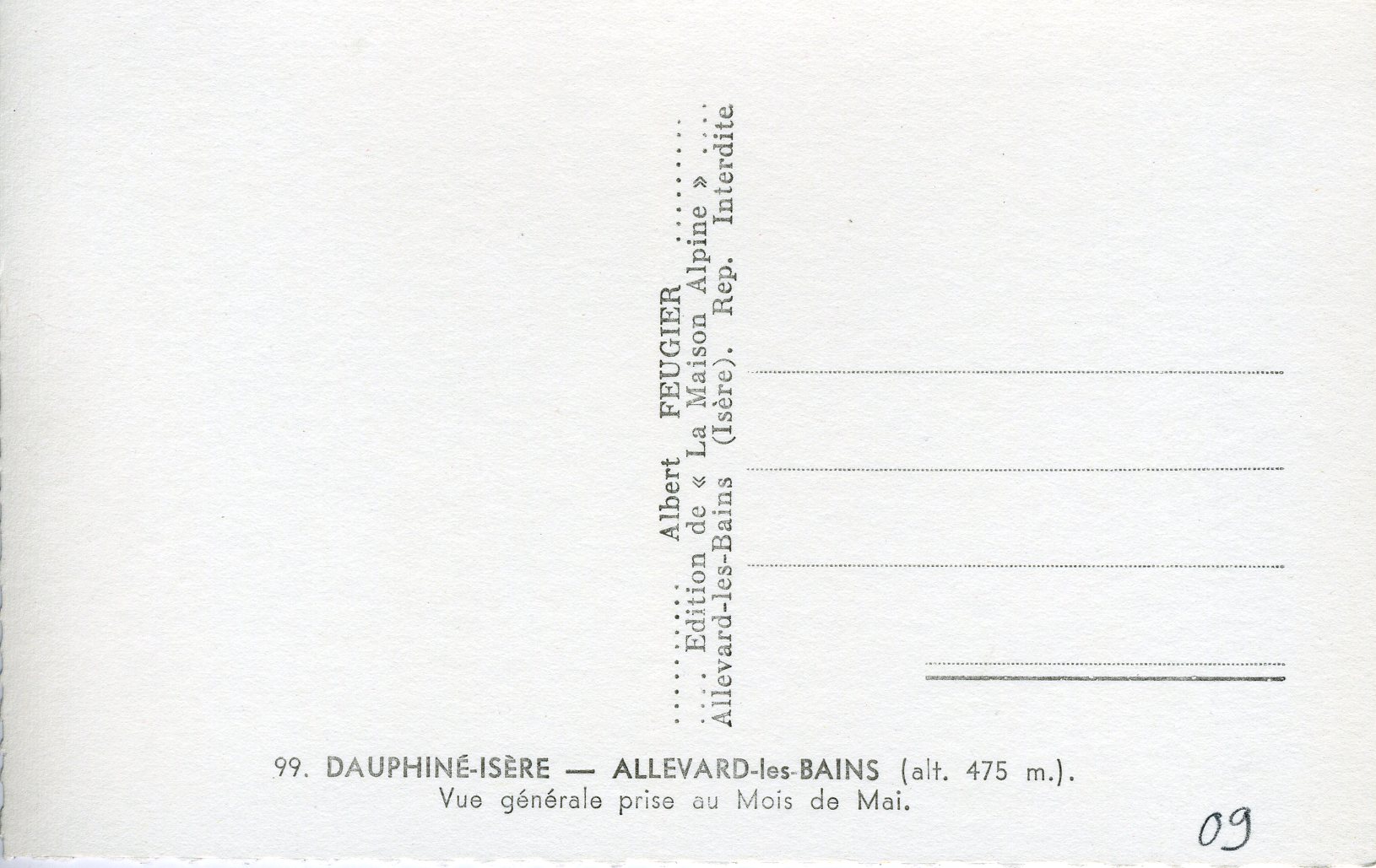 Création : FEUGIER, Albert Marius (Saint-Marcellin, 1893 – Allevard, 1962) ( photographe); Maison Alpine ( éditeur); (La Maison Alpine est une maison d’édition de cartes postales créée à Allevard par Albert Feugier.)