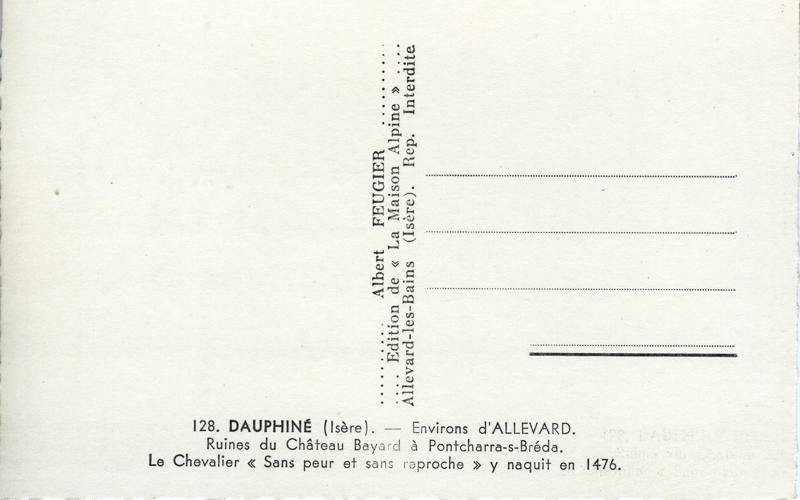 Cette carte postale monochrome présente une vue des ruines du château Bayard, situé à Pontcharra. Il s’agit de l’une des « curiosités » du pays d’Allevard, visité par les curistes lors d’excursions. Au verso, une légende indique quelques éléments historiques sur ce monument. Cette carte postale n’a pas circulé.